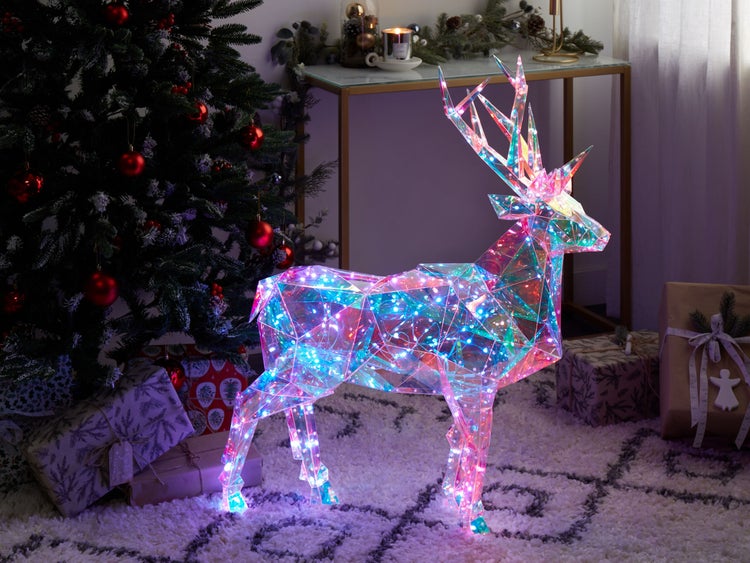 Smart LED Weihnachtsdekoration in Rentierform mit Timerfunktion und Schalter. Diese bezaubernde LED-Rentier-Silhouette eignet sich perfekt für Ihren Außenbereich und lässt sich auch einfach in den Innenbereich befördern. Die majestätische Rentier-Figur selbst besteht aus einer hochwertigen, transparenten Regenbogenfolie, die im Sonnenlicht glänzt und ein magisches Weihnachtsambiente herbeizaubert. Zudem ist die Dekofigur mit einem COB-LED-Leuchtband ausgestattet, das sich über eine App steuern lässt. Mithilfe der App-Steuerung können Sie mühelos fertige Beleuchtungsschemen nutzen oder eigene Beleuchtungssequenzen erstellen sowie die Lichter mit der Musikbibliothek auf dem Smartphone synchronisieren. Dank dem Timer können Sie die Lichter zu jeder gewünschten Zeit und an jedem gewünschten Tag einschalten. Dabei verfügt das Weihnachtsrentier über ein langes Kabel, das Ihnen erlaubt, es an nahezu jedem Ort aufzustellen. Details: Typ LED Deko. Farbe: Bunt. Lichtfarbe: 80000 K. Material: Kunststoff. Material: Kunststoff. Fassung: 10 W. Schutzklasse: IP 44 (spritzwassergeschützt). Anzahl der Glühbirnen: 130. Spannung 5 V. Abmessungen: Kabellänge: 150 cm. Tiefe: 27 cm. Breite: 80 cm. Höhe: 90 cm. Gewicht: 1 kg. .Sie kaufen: 1 x Dekoration. Produktvorteile: Perfekt als saisonale Dekoration, Langes Kabel für einfachen Zugang zur Stromquelle, Ausgestattet mit einem Ein/Aus-Schalter, Ansprechende Farbkombination, Geeignet für den Innen- und Aussenbereich, Geschützt gegen harte Fremdkörper über 1 mm und Spritzwasser mit geringer Geschwindigkeit (IP 44), Steuerung und individuelle Anpassung über Smartphone möglich. Montage: Nicht montiert.20 - 40 Min. Zusatzinformationen: Das Produkt ist nicht mit UK-Steckdosen kompatibel und erfordert die Installation eines entsprechenden Adapters. Beständigkeit: Feuchtigkeitsbeständig. Beständigkeit Text: Feuchtigkeitsbeständigkeit bedeutet, dass der Artikel leichtem Regenschauer und hoher Luftfeuchtigkeit im Außenbereich standhält. Sollte es nicht möglich sein, ihn drinnen zu lagern, sollte er mit einem Regenschutz abgedeckt werden. Wenn Möbel oder Accessoires längere Zeit Feuchtigkeit ausgesetzt werden, kann dies zu anhaltenden Schäden führen. Pflegeanleitung: Kunststoff: 1.Die Reinigung kann mit handelsüblicher milder Seifenlauge und einem weichen Tuch erfolgen. 2.Die Verwendung eines Grills in der Nähe des Möbelstücks sollte mit grösster Vorsicht geschehen, da Funken der Holzkohle stellenweise Beschädigungen verursachen können. Legen Sie aus diesem Grund auch keine heissen Grillzangen und Spiesse auf die Tischplatte. 3.Das Material ist extrem witterungbeständig. Jedoch empfehlen wir für die Wintersaison eine Schutzhülle zu verwenden oder, wenn möglich, die Möbel trocken und kühl drinnen zu lagern.