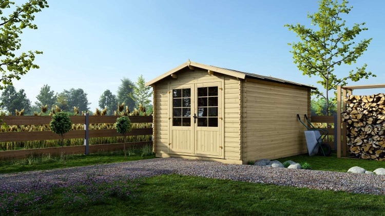 Gartenholzhaus DOM430 von ALTANKA p.s.a. Es ist aus hochwertigem Holz gefertigt. Es ist 3m breit und 4m tief.