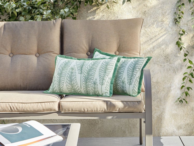 Zwei rechteckige Outdoor-Kissen mit Pflanzemotiven. Mit diesem Dekokissen-Set gelingt es Ihnen, Ihre Loungemöbel aufzufrischen und sie dabei auch noch gemütlicher zu machen. Diese Zierkissen verfügen nicht nur über eine angenehm weiche Polyester-Füllung, sondern auch über abnehmbare Kissenbezüge mit einer wasserabweisenden Oberfläche. Dank der Schutzschicht trotzen die Kissen jedem Regenschauer und auch verschüttete Getränke stellen kein Problem dar, da sich die Kissenhüllen leicht abnehmen und reinigen lassen. Die Rückseiten der Kissenhüllen sind einfarbig gehalten, während ihre Vorderseiten mit modernen Pflanzenmotiven verschönert sind. Ergänzt wird das Ganze mit einer umlaufenden Paspel, die zum Gesamtlook des Kissens perfekt passt. Details: Typ Gartenkissen. Farbe: Grün. Material: Stoff. Material: Polyester. Füllmaterial: Polyester. Zusammenstellung: 100% Polyester. Form: Rechteckig. Muster: Pflanzenmuster. Abmessungen: Tiefe: 50 cm. Breite: 30 cm. Höhe: 12 cm. Füllgewicht: 0.3 kg. Gewicht: 0.4 kg. .Sie kaufen: 2 x Zierkissen. Produktvorteile: Dekorativ und zugleich funktional, Moderne Terrassen- und Gartenmöbel, Geeignet für den Innen- und Aussenbereich, Hohe Qualität, Abnehmbare und feuchtigkeitsabweisende Kissenbezüge. Montage: Benötigt keine Montage. Beständigkeit: Wasserbeständig. Beständigkeit Text: Feuchtigkeitsbeständigkeit bedeutet, dass der Artikel leichtem Regenschauer und hoher Luftfeuchtigkeit im Außenbereich standhält. Sollte es nicht möglich sein, ihn drinnen zu lagern, sollte er mit einem Regenschutz abgedeckt werden. Wenn Möbel oder Accessoires längere Zeit Feuchtigkeit ausgesetzt werden, kann dies zu anhaltenden Schäden führen. Pflegeanleitung: Stoff: 1.Nur von Hand, mit kaltem Wasser und milden Reinigungsmitteln auf der rechten Seite mit geschlossenem Reißverschluss waschen. 2.Bitte nicht im Trockner trocknen und auch nicht bügeln, 3.Wenn die Textilien nicht verwendet werden, sollten sie an einem sauberen und trockenen Ort vor ungünstigen Witterungseinflüssen geschützt werden.