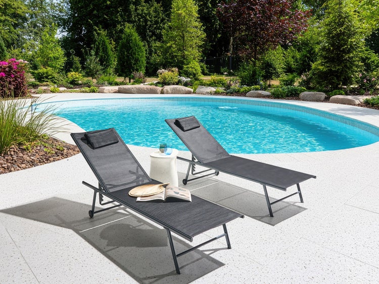 Gartenliegen mit verstellbarer Rückenlehne. Genießen Sie stilvolle Entspannung mit diesem Set aus zwei komfortablen Sonnenliegen. Jede Liege verfügt über einen stabilen Stahlrahmen, strapazierfähiges Sitzmaterial und eine in fünf Positionen verstellbare Rückenlehne. Eine Kopfstütze mit einem kleinen Kissen bietet zusätzlichen Halt. Somit eignen sich die Liegen ideal für lange Stunden im Freien, sei es im Garten, auf der Terrasse oder am Pool. Details: Typ Gartenliege. Farbe: Schwarz. Gestellfarbe: Grau. Material: Metall. Material: Stahl. Zusätzliches Material: Mesh. Zusammenstellung: 30% Polyester. Verstellbare Rückenlehne: Ja. Verstellbar: Rückenlehne. Armlehnen: Nein. Finish: Pulverbeschichtet. Zusammenklappbar: Nein. Abmessungen: Tiefe: 149 cm. Sitzhöhe: 29 cm. Breite: 55 cm. Höhe: 95 cm. Gewicht: 14 kg. Max. Belastung: 120 kg. .Sie kaufen: 2 x Gartenliege, 2 x Kopfstützen. Produktvorteile: Rückenlehne verstellbar in 5 Positionen, Sichere und einfache Befestigung der Kissen dank praktischer Klettverschlüsse, Ausgezeichneter Platz zum Entspannen, Moderne Terrassen- und Gartenmöbel, Wasserdicht dank hochwertiger Materialien. Montage: Teilweise montiert.20 - 40 Min. Beständigkeit: Feuchtigkeitsbeständig. Beständigkeit Text: Feuchtigkeitsbeständigkeit bedeutet, dass der Artikel leichtem Regenschauer und hoher Luftfeuchtigkeit im Außenbereich standhält. Sollte es nicht möglich sein, ihn drinnen zu lagern, sollte er mit einem Regenschutz abgedeckt werden. Wenn Möbel oder Accessoires längere Zeit Feuchtigkeit ausgesetzt werden, kann dies zu anhaltenden Schäden führen. Pflegeanleitung: Stahl: 1.Um die Haltbarkeit Ihrer Gartenmöbel zu verlängern, sollten sie stets vor Feuchtigkeit geschützt und regelmäßig gereinigt werden. 2.Die Reinigung kann mit handelsüblicher milder Seifenlauge erfolgen. 3.Um den Korrosionsschutz des Metalls zu gewährleisten, vermeiden Sie den Kontakt mit säurehaltigen Reinigungsmitteln oder Mitteln mit basischen Komponenten. 4.Wenn das Möbelstück nicht verwendet wird, sollte es im Innenbereich gelagert oder mit einer Schutzhülle abgedeckt werden. 5.Falls vorhanden, Schutzkappen in regelmässigen Abständen lösen, etwaige rostigen Ausflüsse austreten lassen, die unbehandelte Innenseite der Gartenmöbel gründlich austrocknen lassen und ev. Korrosionsschutz-Spray verwenden. 6.Jegliche Schäden an der Außenfarbe sollten vor Feuchtigkeit geschützt werden. 7.Bitte beachten Sie, dass dieses Möbelstück nicht mit Wasser in Kontakt kommen sollte, da dadurch rostiges Wasser aus dem Inneren der Rohrrahmen austreten könnte. 8.Zweimal im Jahr mit einem Versiegelungsmittel oder Rostschutzmittel behandeln, um die Lebensdauer der Möbel zu verlängern. Mesh: 1.Flecken können mit einem Polsterreiniger, einem angefeuchteten Schwamm oder milden Reinigungsmitteln entfernt werden. 2.Oberflächen nur mit geeignetem Aufsatz vorsichtig absaugen. 3.Wenn die Textilien nicht verwendet werden, sollten sie an einem sauberen und trockenen Ort vor ungünstigen Witterungseinflüssen geschützt werden.