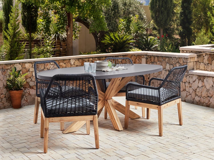 Ovaler Gartentisch aus robustem Faserzement mit 4 Geflecht-Stühlen. Ergänzen Sie Ihren Gartenbereich mit einem 5-teiligen Garten-Set der besonderen Art. Die große, ovale Tischfläche ist aus witterungsbeständigem Faserzement gefertigt und wird selbst bei minimalem Pflegeaufwand viele Jahre überdauern. Sowohl der Tisch als auch die Stühle verfügen über massive Untergestelle aus nachhaltigem Akazienholz. Das Geflecht der 4 Stühle aus robustem Kunststoff, die Armlehnen in einer besonders angenehmen Höhe und die passenden Sitzkissen garantieren einen herrlichen Sitzkomfort. Dieses vielseitige Set eignet sich perfekt für zwanglose Familienmahlzeiten oder formelle Gartentreffen und fügt sich nahtlos in jeden Außenbereich ein. Details: Typ Gartentisch Set. Farbe: Grau. Material: Beton. Material: Faserzement. Zusätzliches Material: Akazienholz. Tischplattenmaterial: Beton. Finish: Laminiert. Schaumstoffdichte: 20 kg/m3. Anzahl Sitzplätze: 4 Personen. Abmessungen: Stuhl: 71x64x89 cm. Dicke der Polsterauflagen: 5 cm. Sitzhöhe: 48 cm. Tisch: 190x100x75 cm. Gesamtmasse: 190x100x75. Gewicht: 73 kg. Max. Belastung pro Stuhl: 150 kg. Max. Belastung des Tischs: 125 kg. .Sie kaufen: 1 x Tisch, 4 x Stühle, 4 x Sitzkissen. Produktvorteile: Betonfinish für einen industriellen Look, Zeitloses Design, Moderne Ausstrahlung und langjährige Qualität, Stabile Verarbeitung, Stabile und solide Konstruktion, Abnehmbare und waschbare Kissenbezüge. Montage: Nicht montiert.60-90 Min. Zusatzinformationen: Holz ist ein Naturprodukt. Farb- und Strukturunterschiede, Narben, Falten und sonstige Naturmerkmale sind Echtheitsbeweise und keine zur Reklamation berechtigende Fehler. Die Möbel können abhängig von der Luftfeuchtigkeit mit der Zeit Porenlöcher, feine Risse und Unregelmässigkeiten in der Färbung aufweisen, dies liegt in der Natur des Materials und macht den eigentlichen Charme des Möbels aus. Dies hat keinen Einfluss auf die Stabilität, sondern es ist eine reine optische Veränderung. Beständigkeit: UV-beständig, Rostbeständig, Wasserbeständig, Schmutzbeständig. Beständigkeit Text: UV-strahlenbeständige Möbel weisen eine erhöhte Beständigkeit gegen Verblassen oder Verfärbung auf. Wir empfehlen jedoch, dass Sie das Produkt bei Nichtgebrauch abgedeckt aufbewahren. Dies gewährleistet die maximale Lebensdauer der Möbel. Dank eines entsprechenden Finish zeichnet sich das Produkt Oberfläche durch eine Rostbeständigkeit aus. Dies bedeutet, dass es im Freien genutzt werden kann. Werden die Möbel nicht genutzt, sollte entweder eine Abdeckung verwendet oder sie sollten an einem trockenen Ort gelagert werden. Dieses Produkt zeichnet sich durch eine hohe Wasserbeständigkeit aus. Dies bedeutet, dass es in Kontakt mit Regen oder anderen Flüssigkeiten nicht beschädigt wird. Sie können das Produkt im Freien, auch bei Regen oder einer hohen Luftfeuchtigkeit nutzen. Außerhalb der Saison sollte das Produkt bedeckt und an einer abgedachten Stelle aufbewahrt werden. Das Produkt wurde aus Materialien gefertigt, die eine hohe Fleckenbeständigkeit aufweisen, weshalb es zu keinen Verfärbungen kommen sollte oder diese leicht zu beseitigen sind. Bei der Fleckenentfernung sind die Pflegehinweise zu berücksichtigen. Pflegeanleitung: Faserzement: 1.Nicht mit säurehaltigen, scheuernden oder fettigen Reinigungsmitteln behandeln, da diese Spuren hinterlassen können. 2.Wir empfehlen für die Wintersaison eine Schutzhülle zu verwenden oder, wenn möglich, die Möbel trocken und kühl drinnen zu lagern. 3.Betonmöbel sollten vor starkem Regen geschützt werden. Akazienholz: 1.Bitte ausschließlich milde Reinigungsmittel und weiche Tücher verwenden. Dabei immer in Richtung der Maserung abwischen. Feuchte Stellen sofort mit einem weichen Tuch trocken reiben und Dauernässe bei der Reinigung vermeiden. 2.Geöltes Holz sollte vor der Benutzung und nach der Saison vor der Einlagerung nachgeölt werden, besonders bei feuchtem Klima. 3.Wir empfehlen bei ungünstigen Witterungsbedingungen und für die Wintersaison eine Schutzabdeckung zu verwenden oder, wenn möglich, die Gartenmöbel trocken und kühl drinnen zu lagern. Stoff: 1.Sofern vom Hersteller nicht anders vorgegeben, bitte auf der rechten Seite mit geschlossenem Reißverschluss in einem Feinwäsche-Programm oder per Handwäsche bei max. 30°C waschen. 2.Bitte nicht im Trockner trocknen und auch nicht bügeln, 3.Wenn die Textilien nicht verwendet werden, sollten sie an einem sauberen und trockenen Ort vor ungünstigen Witterungseinflüssen geschützt werden.