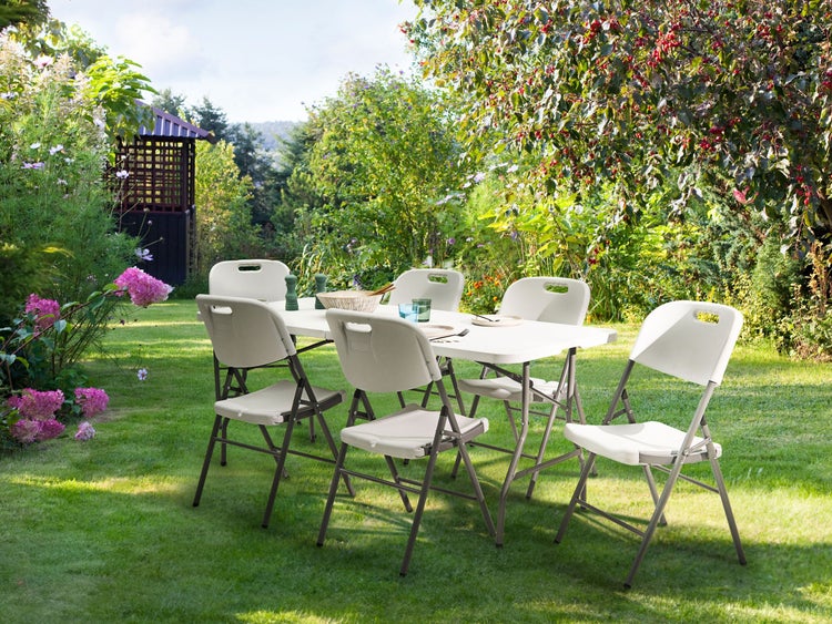Gartenmöbel-Set mit 6 Klappstühlen. Genieße das Essen im Freien mit diesem praktischen und modernen Outdoor-Set, das einen Tisch und vier passende Stühle umfasst – ideal für Terrasse und Garten. Mit dem Fokus auf platzsparende Funktionalität können sowohl der Tisch als auch die Stühle mühelos zusammengeklappt werden, was eine einfache Lagerung oder den Transport ermöglicht. So sind sie perfekt für kleinere Bereiche oder spontane Ausflüge. Die Tischplatte besteht aus strapazierfähigem, pflegeleichtem synthetischem Material, das für langanhaltende Funktionalität sorgt, während stabile Metallbeine für Standfestigkeit und Komfort sorgen – auch an windigen Tagen oder auf unebenem Boden bleibt alles an seinem Platz. Mit ihrem minimalistischen Design und zeitlosen Farben fügt sich das Set mühelos in jede moderne Gartengestaltung ein. Details: Typ Gartentisch Set. Farbe: Weiß. Material: Kunststoff. Material: Kunststoff. Zusätzliches Material: Stahl. Tischplattenmaterial: Kunststoff. Finish: Pulverbeschichtet. Anzahl Sitzplätze: 6 Personen. Abmessungen: Stuhl: 44x51x90 cm. Sitzhöhe: 44 cm. Tisch: 180x74x74 cm. Gesamtmasse: 180x74x74. Gewicht: 35 kg. Max. Belastung pro Stuhl: 200 kg. Max. Belastung des Tischs: 200 kg. .Sie kaufen: 1 x Tisch, 6 x Stühle. Produktvorteile: Mit einem robusten Tragehenkel ausgestattet, Moderne Terrassen- und Gartenmöbel, Speziell für die Nutzung im Außenbereich entworfen, Korrosionsfreies Gestell, Platzsparend zusammenklappbar, Besonders pflegeleicht. Montage: Benötigt keine Montage. Zusatzinformationen: Um sicherzustellen, dass die Konstruktion stabil und die Nutzungssicherheit gewährleistet ist, sollte man 2 Wochen nach dem Zusammenbau überprüfen, ob die Ware auch korrekt montiert wurde. Außerdem ist alle 3 Monate zu prüfen, ob die Schrauben richtig festgezogen sind. Beständigkeit: Rostbeständig, Windbeständig, Feuchtigkeitsbeständig. Beständigkeit Text: Feuchtigkeitsbeständigkeit bedeutet, dass der Artikel leichtem Regenschauer und hoher Luftfeuchtigkeit im Außenbereich standhält. Sollte es nicht möglich sein, ihn drinnen zu lagern, sollte er mit einem Regenschutz abgedeckt werden. Wenn Möbel oder Accessoires längere Zeit Feuchtigkeit ausgesetzt werden, kann dies zu anhaltenden Schäden führen. Dieses Produkt besitzt eine hohe Windbeständigkeit, weshalb es nicht umkippen oder seine Stabilität aufgrund von Windböen verlieren sollte. Dank eines entsprechenden Finish zeichnet sich das Produkt Oberfläche durch eine Rostbeständigkeit aus. Dies bedeutet, dass es im Freien genutzt werden kann. Werden die Möbel nicht genutzt, sollte entweder eine Abdeckung verwendet oder sie sollten an einem trockenen Ort gelagert werden. Pflegeanleitung: Kunststoff: 1.Die Reinigung kann mit handelsüblicher milder Seifenlauge und einem weichen Tuch erfolgen. 2.Die Verwendung eines Grills in der Nähe des Möbelstücks sollte mit grösster Vorsicht geschehen, da Funken der Holzkohle stellenweise Beschädigungen verursachen können. Legen Sie aus diesem Grund auch keine heissen Grillzangen und Spiesse auf die Tischplatte. 3.Das Material ist extrem witterungbeständig. Jedoch empfehlen wir für die Wintersaison eine Schutzhülle zu verwenden oder, wenn möglich, die Möbel trocken und kühl drinnen zu lagern. Stahl: 1.Um die Haltbarkeit Ihrer Gartenmöbel zu verlängern, sollten sie stets vor Feuchtigkeit geschützt und regelmäßig gereinigt werden. 2.Die Reinigung kann mit handelsüblicher milder Seifenlauge erfolgen. 3.Um den Korrosionsschutz des Metalls zu gewährleisten, vermeiden Sie den Kontakt mit säurehaltigen Reinigungsmitteln oder Mitteln mit basischen Komponenten. 4.Wenn das Möbelstück nicht verwendet wird, sollte es im Innenbereich gelagert oder mit einer Schutzhülle abgedeckt werden. 5.Falls vorhanden, Schutzkappen in regelmässigen Abständen lösen, etwaige rostigen Ausflüsse austreten lassen, die unbehandelte Innenseite der Gartenmöbel gründlich austrocknen lassen und ev. Korrosionsschutz-Spray verwenden. 6.Jegliche Schäden an der Außenfarbe sollten vor Feuchtigkeit geschützt werden. 7.Bitte beachten Sie, dass dieses Möbelstück nicht mit Wasser in Kontakt kommen sollte, da dadurch rostiges Wasser aus dem Inneren der Rohrrahmen austreten könnte. 8.Zweimal im Jahr mit einem Versiegelungsmittel oder Rostschutzmittel behandeln, um die Lebensdauer der Möbel zu verlängern.
