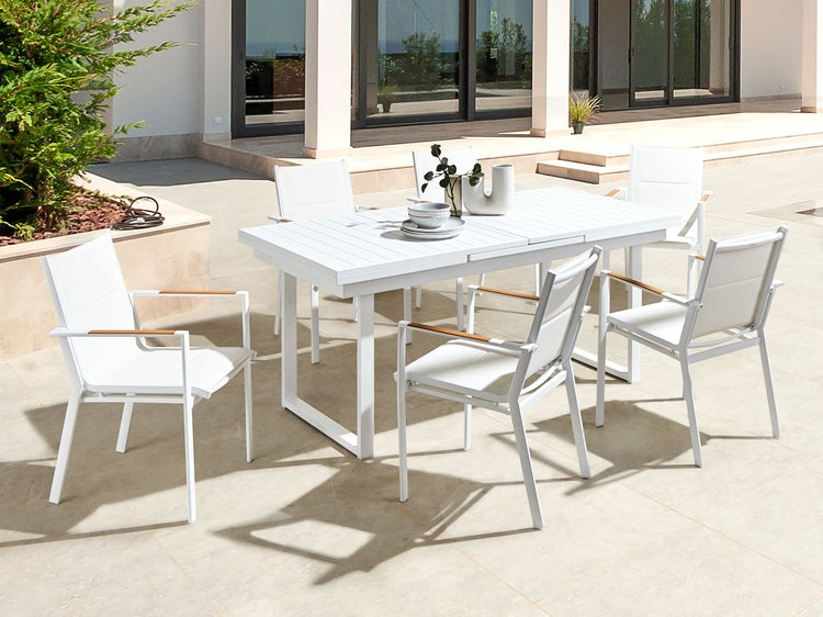 Ausziehbarer Esstisch für den Außenbereich mit 6 passenden Stühlen. Mit diesem stilvollen Ausziehtisch und den 6 bequemen Gartenstühlen sind Sie immer für jeden kleineren als auch größeren Besuch gerüstet. Der Outdoor-Tisch verfügt über einen versteckten Tischplattenteil, die under der Tischplatte befestigt ist und sich beim Ausziehen des Tisches automatisch aufrichtet. Die stabilen Metallgestelle sind extrem langlebig, strapazierfähig und wurden zusätzlich pulverbeschichtet, um die Korrosions- und Witterungsbeständigkeit des Sets zu erhöhen. Die ganze Sitzfläche der Stühle ist mit einem dicken, outdoortauglichen Stoff bespannt, der nicht nur sehr pflegeleicht ist, sondern auch einen hohen Sitzkomfort garantiert. Das moderne Kunststoffgewebe ist feuchtigkeitsresistent, schnelltrocknend und dank hoher Luftdurchlässigkeit äußerst hautsympathisch. Dabei sind die Alu-Stühle platzsparend verstaubar und wegen ihres leichten Gewichts auch einfach transportierbar. Details: Typ Gartentisch Set. Farbe: Weiß. Material: Metall. Material: Aluminium. Zusätzliches Material: Textil. Tischplattenmaterial: Metall. Zusammenstellung: 100% PVC. Finish: Pulverbeschichtet. Anzahl Sitzplätze: 6 Personen. Abmessungen: Stuhl: 56x64x90 cm. Sitzhöhe: 39 cm. Tisch: 180/240 x 90 x 78 cm. Gesamtmasse: 110x110x74. Gewicht: 64 kg. Max. Belastung pro Stuhl: 150 kg. Max. Belastung des Tischs: 120 kg. .Sie kaufen: 1 x Tisch, 6 x Stühle. Produktvorteile: Perfekt für Mahlzeiten in großer Runde, Moderne Terrassen- und Gartenmöbel, Stabile und solide Konstruktion, UV-Beständigkeit Klasse 5 (ISO 105-B02), Ausziehbare Tischplatte für zusätzlichen Platz, Platzsparend stapelbar. Montage: Teilweise montiert.5 - 15 Min. Beständigkeit: Rostbeständig, UV-beständig, Schmutzbeständig, Feuchtigkeitsbeständig. Beständigkeit Text: Dank eines entsprechenden Finish zeichnet sich das Produkt Oberfläche durch eine Rostbeständigkeit aus. Dies bedeutet, dass es im Freien genutzt werden kann. Werden die Möbel nicht genutzt, sollte entweder eine Abdeckung verwendet oder sie sollten an einem trockenen Ort gelagert werden. Dieser Artikel ist aus solchen Stoffen gefertigt, die im Vergleich zu Standardgeweben über eine stärkere UV-Beständigkeit verfügen und somit eine höhere Farbbeständigkeit aufweisen. Trotzdem sollte man das Produkt bei Nichtgebrauch abgedeckt aufbewahren, um seine Lebensdauer zu verlängern. Das Produkt wurde aus Materialien gefertigt, die eine hohe Fleckenbeständigkeit aufweisen, weshalb es zu keinen Verfärbungen kommen sollte oder diese leicht zu beseitigen sind. Bei der Fleckenentfernung sind die Pflegehinweise zu berücksichtigen. Feuchtigkeitsbeständigkeit bedeutet, dass der Artikel leichtem Regenschauer und hoher Luftfeuchtigkeit im Außenbereich standhält. Sollte es nicht möglich sein, ihn drinnen zu lagern, sollte er mit einem Regenschutz abgedeckt werden. Wenn Möbel oder Accessoires längere Zeit Feuchtigkeit ausgesetzt werden, kann dies zu anhaltenden Schäden führen. Pflegeanleitung: Aluminium: 1.Die Reinigung kann mit handelsüblicher milder Seifenlauge erfolgen, bitte dabei ausschließlich milde Reinigungsmittel verwenden. 2.Wir empfehlen für die Wintersaison eine Schutzhülle zu verwenden oder, wenn möglich, die Möbel trocken und kühl drinnen zu lagern. Textil: 1.Flecken können mit einem Polsterreiniger, einem angefeuchteten Schwamm oder milden Reinigungsmitteln entfernt werden. 2.Oberflächen nur mit geeignetem Aufsatz vorsichtig absaugen. 3.Wenn die Textilien nicht verwendet werden, sollten sie an einem sauberen und trockenen Ort vor ungünstigen Witterungseinflüssen geschützt werden.