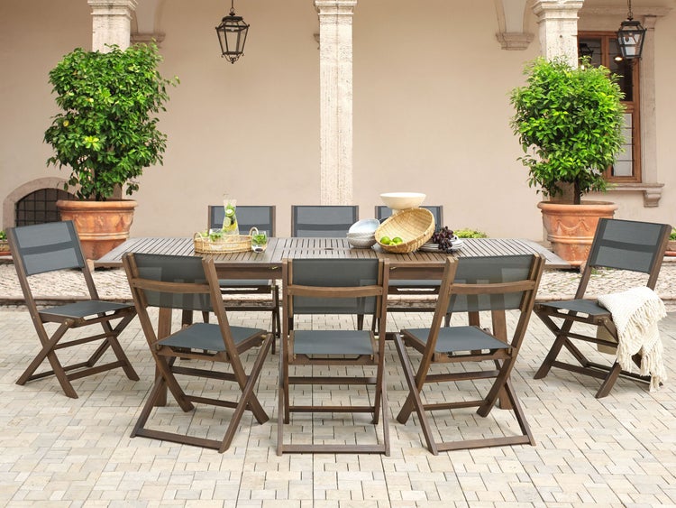 Exklusives Gartentisch Set aus Akazienholz für 8 Personen. Sobald die ersten Sonnenstrahlen den Sommer ankündigen, wird der Gartentisch schnell wieder zum beliebten Treffpunkt für Familie, Freunde und Nachbarn. Um so besser, wenn die Tischplatte bei Bedarf mit wenigen Handgriffen an den beiden Kopfenden ausziehbar ist. Dieses Gartentisch Set mit 8 bequemen Stühlen bietet jede Menge Platz für gemütliche Stunden im Garten. Der robuste Tisch und die zusammenklappbaren Stuhlgestelle sind aus beständigem Akazienholz in einem dunklen Braunton gefertigt, die strapazierfähige Bespannung der Sitz- und Rückenflächen ist aus grauem Stoff. Diese Farbkombination und das gradlinige Design verleihen den Gartenmöbeln eine besonders elegante und exklusive Ausstrahlung. Details: Typ Gartentisch Set. Farbe: Braun. Material: Holz. Material: Akazienholz. Zusätzliches Material: PVC. Tischplattenmaterial: Holz. Zusammenstellung: 70% PVC. Finish: Geölt. Anzahl Sitzplätze: 8 Personen. Abmessungen: Stuhl: 57x50x90 cm. Sitzhöhe: 45 cm. Tisch: 180/240x100x75 cm. Gesamtmasse: 180/240x100x75. Gewicht: 70 kg. Max. Belastung pro Stuhl: 160 kg. Max. Belastung des Tischs: 75 kg. .Sie kaufen: 1 x Tisch, 8 x Stühle. Produktvorteile: Perfekt für Mahlzeiten in großer Runde, Tischplatte mit Schirmloch, Klassisches Design, Solide Verarbeitung, UV-Beständigkeit Klasse 3 (ISO 105-B02), Damit die Qualität des Artikels erhalten bleibt, sollte er vor Wasser und Regen geschützt werden, Platzsparend zusammenklappbar, Ausziehbare Tischplatte für zusätzlichen Platz. Montage: Teilweise montiert.5 - 15 Min. Zusatzinformationen: Holz ist ein Naturprodukt. Farb- und Strukturunterschiede, Narben, Falten und sonstige Naturmerkmale sind Echtheitsbeweise und keine zur Reklamation berechtigende Fehler. Damit das folgende Produkt jahrelang seine Schönheit beibehält, stellen wir Ihnen ein ausführliches Pflegehandbuch zur Verfügung. Die Pflegeanleitung und Tipps zur richtigen Wartung Ihres neuen Produkts finden Sie finden Sie unten im Abschnitt „Verpackung und Montage“. Beständigkeit: Feuchtigkeitsbeständig, Schmutzbeständig, UV-beständig. Beständigkeit Text: Feuchtigkeitsbeständigkeit bedeutet, dass der Artikel leichtem Regenschauer und hoher Luftfeuchtigkeit im Außenbereich standhält. Sollte es nicht möglich sein, ihn drinnen zu lagern, sollte er mit einem Regenschutz abgedeckt werden. Wenn Möbel oder Accessoires längere Zeit Feuchtigkeit ausgesetzt werden, kann dies zu anhaltenden Schäden führen. Das Produkt wurde aus Materialien gefertigt, die eine hohe Fleckenbeständigkeit aufweisen, weshalb es zu keinen Verfärbungen kommen sollte oder diese leicht zu beseitigen sind. Bei der Fleckenentfernung sind die Pflegehinweise zu berücksichtigen. Dieser Artikel ist aus solchen Stoffen gefertigt, die im Vergleich zu Standardgeweben über eine stärkere UV-Beständigkeit verfügen und somit eine höhere Farbbeständigkeit aufweisen. Trotzdem sollte man das Produkt bei Nichtgebrauch abgedeckt aufbewahren, um seine Lebensdauer zu verlängern. Pflegeanleitung: Akazienholz: 1.Bitte ausschließlich milde Reinigungsmittel und weiche Tücher verwenden. Dabei immer in Richtung der Maserung abwischen. Feuchte Stellen sofort mit einem weichen Tuch trocken reiben und Dauernässe bei der Reinigung vermeiden. 2.Geöltes Holz sollte vor der Benutzung und nach der Saison vor der Einlagerung nachgeölt werden, besonders bei feuchtem Klima. 3.Wir empfehlen bei ungünstigen Witterungsbedingungen und für die Wintersaison eine Schutzabdeckung zu verwenden oder, wenn möglich, die Gartenmöbel trocken und kühl drinnen zu lagern. Stoff: 1.Die Reinigung kann mit handelsüblicher milder Seifenlauge und einem weichen Tuch erfolgen. 2.Die Verwendung eines Grills in der Nähe des Möbelstücks sollte mit grösster Vorsicht geschehen, da Funken der Holzkohle stellenweise Beschädigungen verursachen können. Legen Sie aus diesem Grund auch keine heissen Grillzangen und Spiesse auf die Tischplatte. 3.Das Material ist extrem witterungbeständig. Jedoch empfehlen wir für die Wintersaison eine Schutzhülle zu verwenden oder, wenn möglich, die Möbel trocken und kühl drinnen zu lagern.