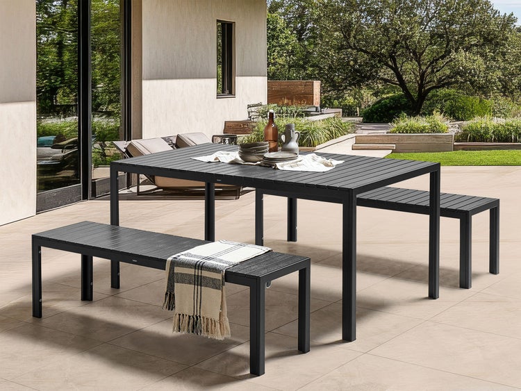 Edle Kunstholz Sitzgruppe in Schwarz. Für diese Möbel Reihe wurde ausschließlich qualitativ hochwertigstes Kunstholz benutzt. Das verwendete Aluminium wird exoliert. Sowohl Kunstholz, wie auch Aluminium lassen sich vollständig recyclen und sind umweltschonend produziert. Zusätzlich zum Tisch erwerben Sie ebenfalls 2 passende Gartenbänke, welche sich ebenfalls hervorragend einzeln im Garten, auf der Terrasse oder auch auf dem Balkon aufstellen lassen. Das Gartentischset ist überaus gut kombinierbar mit anderen Gartenmöbeln oder Accessoires. Details: Typ Gartentisch Set. Farbe: Schwarz. Material: Kunststoff. Material: Kunstholz. Zusätzliches Material: Aluminium. Tischplattenmaterial: Kunststoff. Finish: Pulverbeschichtet. Anzahl Sitzplätze: 6 Personen. Abmessungen: Bank: 165x40x45. Sitzhöhe: 45 cm. Tisch: 180x90x75 cm. Gesamtmasse: 180x90x75. Gewicht: 44 kg. Max. Belastung des Tischs: 100 kg. .Sie kaufen: 1 x Tisch, 2 x Bänke. Produktvorteile: Moderne Terrassen- und Gartenmöbel, UV-Beständigkeit, Pflegeleichtes und strapazierfähiges Material, Korrosionsfreies Gestell, Speziell für die Nutzung im Außenbereich entworfen, Witterungsbeständiges Material, Schutzkappen zum Schutz des Bodens. Montage: Teilweise montiert.45 - 60 Min. Zusatzinformationen: Bitte kein Glas direkt auf die Oberfläche des Artikels stellen, dies erhöht die Sonnenlichttemperatur und kann zu Überhitzung und somit Beschädigung des Produktes führen. Damit das folgende Produkt jahrelang seine Schönheit beibehält, stellen wir Ihnen ein ausführliches Pflegehandbuch zur Verfügung. Die Pflegeanleitung und Tipps zur richtigen Wartung Ihres neuen Produkts finden Sie finden Sie unten im Abschnitt „Verpackung und Montage“. Beständigkeit: Rostbeständig, Wasserbeständig, Windbeständig, Schmutzbeständig, UV-beständig. Beständigkeit Text: Dank eines entsprechenden Finish zeichnet sich das Produkt Oberfläche durch eine Rostbeständigkeit aus. Dies bedeutet, dass es im Freien genutzt werden kann. Werden die Möbel nicht genutzt, sollte entweder eine Abdeckung verwendet oder sie sollten an einem trockenen Ort gelagert werden. Dieses Produkt zeichnet sich durch eine hohe Wasserbeständigkeit aus. Dies bedeutet, dass es in Kontakt mit Regen oder anderen Flüssigkeiten nicht beschädigt wird. Sie können das Produkt im Freien, auch bei Regen oder einer hohen Luftfeuchtigkeit nutzen. Außerhalb der Saison sollte das Produkt bedeckt und an einer abgedachten Stelle aufbewahrt werden. Dieses Produkt besitzt eine hohe Windbeständigkeit, weshalb es nicht umkippen oder seine Stabilität aufgrund von Windböen verlieren sollte. Das Produkt wurde aus Materialien gefertigt, die eine hohe Fleckenbeständigkeit aufweisen, weshalb es zu keinen Verfärbungen kommen sollte oder diese leicht zu beseitigen sind. Bei der Fleckenentfernung sind die Pflegehinweise zu berücksichtigen. UV-strahlenbeständige Möbel weisen eine erhöhte Beständigkeit gegen Verblassen oder Verfärbung auf. Wir empfehlen jedoch, dass Sie das Produkt bei Nichtgebrauch abgedeckt aufbewahren. Dies gewährleistet die maximale Lebensdauer der Möbel. Pflegeanleitung: Kunstholz: 1.Die Reinigung kann mit handelsüblicher milder Seifenlauge und einem weichen Tuch erfolgen. 2.Die Verwendung eines Grills in der Nähe des Möbelstücks sollte mit grösster Vorsicht geschehen, da Funken der Holzkohle stellenweise Beschädigungen verursachen können. Legen Sie aus diesem Grund auch keine heissen Grillzangen und Spiesse auf die Tischplatte. 3.Das Material ist extrem witterungbeständig. Jedoch empfehlen wir für die Wintersaison eine Schutzhülle zu verwenden oder, wenn möglich, die Möbel trocken und kühl drinnen zu lagern. Aluminium: 1.Die Reinigung kann mit handelsüblicher milder Seifenlauge erfolgen, bitte dabei ausschließlich milde Reinigungsmittel verwenden. 2.Wir empfehlen für die Wintersaison eine Schutzhülle zu verwenden oder, wenn möglich, die Möbel trocken und kühl drinnen zu lagern.
