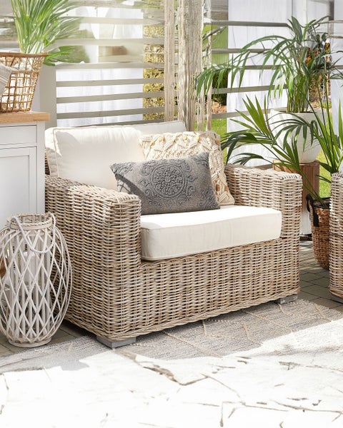 Rattansessel mit viel Sitzkomfort. Ob beim entspannten Cocktails Schlürfen im Garten oder während gemütlicher Leseabende mit Kuscheldecke auf der Terrasse - dieser Sessel gibt immer eine gute Figur ab. Dank der naturgetreuen Rattanoptik und den dazugehörigen weichen Kissen ist der Stuhl ein richtiger Lounge-Akzent jedes Outdoorbereiches und lädt zum Chillen und Entspannen ein. Dieses Gartenaccessoire lässt sich perfekt sowohl mit einem hellen modernen Kaffeetisch kombinieren, als auch mit kleineren Beistelltischen aus Holz, Rattan oder Metall. Details: Typ Sessel. Stil: Mediterran. Farbe: Naturfarben. Material: Rattan. Material: Rattan. Zusätzliches Material: Mahagoniholz. Gestellmaterial: Holz. Sitzmaterial: Stoff. Zusammenstellung: 100% Polyester. Armlehnen: Ja. Finish: Pulverbeschichtet. Zusammenklappbar: Nein. Schaumstoffdichte: 22 kg/m3. Stapelbar: Nein. Abmessungen: Höhe Armlehnen: 60 cm. Tiefe: 90 cm. Dicke der Polsterauflagen: 12 cm. Sitzhöhe: 45 cm. Breite: 112 cm. Höhe: 70 cm. Sitzfläche: 80x75 cm. Gewicht: 36.5 kg. Max. Belastung: 120 kg. .Sie kaufen: 1 x Sitzkissen, 1 x Sessel, 1 x Rückenkissen. Produktvorteile: Ausgezeichneter Platz zum Entspannen, Moderne Terrassen- und Gartenmöbel, Handgefertigtes Flechtwerk betont den einzigartigen Charakter, Hochwertiges Material, Abnehmbare und waschbare Kissenbezüge, Kissenbezüge mit versteckten Nähten und Reissverschlüssen. Montage: Benötigt keine Montage. Zusatzinformationen: Bitte beachten Sie, dass das Produkt wetterempfindlich ist und bei Nichtgebrauch im Inneren aufbewahrt werden sollte. Es ist nicht empfehlenswert, die Möbel bei schlechterem Wetter nur unter einer Abdeckung draußen stehen zu lassen. In der Nebensaison empfehlen wir, die Möbel drinnen an einem trockenen und kühlen Ort aufzubewahren. Bitte beachten Sie, dass jedes Produkt handgefertigt ist. Abweichungen in Struktur, Farbe oder Form können aufgrund der Eigenschaften der verwendeten Materialien auftreten und stellen keinen Qualitätsmangel dar. Damit das folgende Produkt jahrelang seine Schönheit beibehält, stellen wir Ihnen ein ausführliches Pflegehandbuch zur Verfügung. Die Pflegeanleitung und Tipps zur richtigen Wartung Ihres neuen Produkts finden Sie finden Sie unten im Abschnitt „Verpackung und Montage“. Pflegeanleitung: Rattan: 1.Außerhalb der Saison und bei Nichtgebrauch sollten die Möbel im Innenraum gelagert werden, 2.Vor direkter Sonneneinstrahlung, Regenfälle und Feuchtigkeit schützen, 3.Zur Reinigung die Möbel leicht mit Wasser besprühen und anschließend trocken wischen. Stoff: 1.Sofern vom Hersteller nicht anders vorgegeben, bitte auf der rechten Seite mit geschlossenem Reißverschluss in einem Feinwäsche-Programm oder per Handwäsche bei max. 30°C waschen. 2.Bitte nicht im Trockner trocknen und auch nicht bügeln, 3.Wenn die Textilien nicht verwendet werden, sollten sie an einem sauberen und trockenen Ort vor ungünstigen Witterungseinflüssen geschützt werden.
