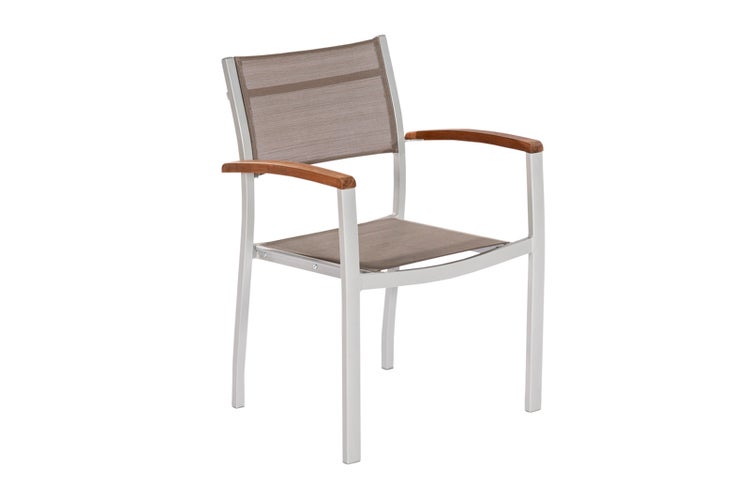 Nimes Stapelsessel, 2er Set Der Stapelsessel Nimes besticht durch eine moderne Optik und einer gelungenen Kombination aus drei Materialien. Das silberfarbene Aluminiumgestell harmoniert hervorragend mit der grauen Textilbespannung und dem dunkel geölten Akazienholz. Zum einfachen verstauen lassen sich die Sessel platzsparend übereinander stapeln. Die Serie Nimes besteht aus einem pulverbeschichteten Aluminiumgestell, Textilbespannung und geölten Akazienholz.