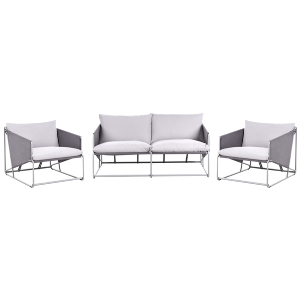 Niedrige, extra breite Loungemöbel mit bequemen Kissen. Dieses übergroße Lounge-Set, bestehend aus einem 2-Sitzer-Sofa und zwei passenden Sesseln, vereint modernes Design mit höchstem Sitzkomfort. Die minimalistischen Metallgestelle und die großzügig gepolsterten Sitzflächen schaffen eine moderne und zugleich einladende Atmosphäre im Innen- oder Außenbereich. Der Bezug aus wasserfestem Stoff macht das Gartensofa und die Gartensessel besonders langlebig, pflegeleicht und witterungsbeständig. Abnehmbare Bezüge an den Armlehnen sorgen zusätzlich für Komfort. Als Teil einer Kollektion bietet das Set eine harmonische und stilvolle Sitzlösung, perfekt für eine elegante und funktionale Lounge-Ecke auf Terrasse, im Garten oder im Wohnzimmer. Details: Typ Lounge Set. Stil: Industriell. Farbe: Grau. Gestellfarbe: Grau. Material: Metall. Material: Stahl. Zusätzliches Material: Stoff. Zusammenstellung: 100% Polyester. Finish: Galvanisiert. Anzahl Sitzplätze: 4 Personen. Abmessungen: Sofa 2-Sitzer: 160x94x88. Sessel: 80x94x88. Sitzhöhe: 37 cm. Gesamtmasse: 160x94x88. Gewicht: 62 kg. Max. Belastung p.P: 110 kg. .Sie kaufen: 1 x Zweisitzer, 2 x Stühle, 4 x Sitzkissen, 4 x Rückenkissen. Produktvorteile: Sehr komfortabel, Niedrige und tiefe Sitzfläche, Moderne Terrassen- und Gartenmöbel, Besonders pflegeleicht und langlebig, UV-Beständigkeit Klasse 5 (ISO 105-B02), Abnehmbare Bezüge. Montage: Nicht montiert.90-120 Min. Beständigkeit: UV-beständig, Feuchtigkeitsbeständig. Beständigkeit Text: UV-strahlenbeständige Möbel weisen eine erhöhte Beständigkeit gegen Verblassen oder Verfärbung auf. Wir empfehlen jedoch, dass Sie das Produkt bei Nichtgebrauch abgedeckt aufbewahren. Dies gewährleistet die maximale Lebensdauer der Möbel. Dieses Produkt zeichnet sich durch eine hohe Wasserbeständigkeit aus. Dies bedeutet, dass es in Kontakt mit Regen oder anderen Flüssigkeiten nicht beschädigt wird. Sie können das Produkt im Freien, auch bei Regen oder einer hohen Luftfeuchtigkeit nutzen. Außerhalb der Saison sollte das Produkt bedeckt und an einer abgedachten Stelle aufbewahrt werden. Pflegeanleitung: Stahl: 1.Die Reinigung kann mit handelsüblicher milder Seifenlauge erfolgen, bitte dabei ausschließlich milde Reinigungsmittel verwenden. 2.Wir empfehlen für die Wintersaison eine Schutzhülle zu verwenden oder, wenn möglich, die Möbel trocken und kühl drinnen zu lagern. Stoff: 1.Sofern vom Hersteller nicht anders vorgegeben, bitte auf der rechten Seite mit geschlossenem Reißverschluss in einem Feinwäsche-Programm oder per Handwäsche bei max. 30°C waschen. 2.Bitte nicht im Trockner trocknen und auch nicht bügeln, 3.Wenn die Textilien nicht verwendet werden, sollten sie an einem sauberen und trockenen Ort vor ungünstigen Witterungseinflüssen geschützt werden.