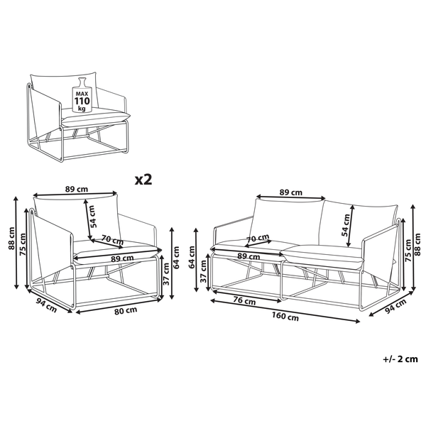 Niedrige, extra breite Loungemöbel mit bequemen Kissen. Dieses übergroße Lounge-Set, bestehend aus einem 2-Sitzer-Sofa und zwei passenden Sesseln, vereint modernes Design mit höchstem Sitzkomfort. Die minimalistischen Metallgestelle und die großzügig gepolsterten Sitzflächen schaffen eine moderne und zugleich einladende Atmosphäre im Innen- oder Außenbereich. Der Bezug aus wasserfestem Stoff macht das Gartensofa und die Gartensessel besonders langlebig, pflegeleicht und witterungsbeständig. Abnehmbare Bezüge an den Armlehnen sorgen zusätzlich für Komfort. Als Teil einer Kollektion bietet das Set eine harmonische und stilvolle Sitzlösung, perfekt für eine elegante und funktionale Lounge-Ecke auf Terrasse, im Garten oder im Wohnzimmer. Details: Typ Lounge Set. Stil: Industriell. Farbe: Beige. Gestellfarbe: Hellbeige. Farbton: Hellbeige. Material: Metall. Material: Stahl. Zusätzliches Material: Stoff. Zusammenstellung: 100% Polyester. Finish: Galvanisiert. Anzahl Sitzplätze: 4 Personen. Abmessungen: Sofa 2-Sitzer: 160x94x88. Sessel: 80x94x88. Sitzhöhe: 37 cm. Gesamtmasse: 160x94x88. Gewicht: 62 kg. Max. Belastung p.P: 110 kg. .Sie kaufen: 1 x Zweisitzer, 2 x Stühle, 4 x Sitzkissen, 4 x Rückenkissen. Produktvorteile: Sehr komfortabel, Niedrige und tiefe Sitzfläche, Moderne Terrassen- und Gartenmöbel, Besonders pflegeleicht und langlebig, UV-Beständigkeit Klasse 5 (ISO 105-B02), Abnehmbare Bezüge. Montage: Nicht montiert.90-120 Min. Beständigkeit: UV-beständig, Feuchtigkeitsbeständig. Beständigkeit Text: UV-strahlenbeständige Möbel weisen eine erhöhte Beständigkeit gegen Verblassen oder Verfärbung auf. Wir empfehlen jedoch, dass Sie das Produkt bei Nichtgebrauch abgedeckt aufbewahren. Dies gewährleistet die maximale Lebensdauer der Möbel. Dieses Produkt zeichnet sich durch eine hohe Wasserbeständigkeit aus. Dies bedeutet, dass es in Kontakt mit Regen oder anderen Flüssigkeiten nicht beschädigt wird. Sie können das Produkt im Freien, auch bei Regen oder einer hohen Luftfeuchtigkeit nutzen. Außerhalb der Saison sollte das Produkt bedeckt und an einer abgedachten Stelle aufbewahrt werden. Pflegeanleitung: Stahl: 1.Die Reinigung kann mit handelsüblicher milder Seifenlauge erfolgen, bitte dabei ausschließlich milde Reinigungsmittel verwenden. 2.Wir empfehlen für die Wintersaison eine Schutzhülle zu verwenden oder, wenn möglich, die Möbel trocken und kühl drinnen zu lagern. Stoff: 1.Sofern vom Hersteller nicht anders vorgegeben, bitte auf der rechten Seite mit geschlossenem Reißverschluss in einem Feinwäsche-Programm oder per Handwäsche bei max. 30°C waschen. 2.Bitte nicht im Trockner trocknen und auch nicht bügeln, 3.Wenn die Textilien nicht verwendet werden, sollten sie an einem sauberen und trockenen Ort vor ungünstigen Witterungseinflüssen geschützt werden.