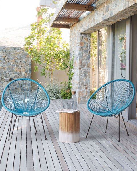 Trendy Spaghetti-Sessel in Blau für den Innen- und Außenbereich. Das fröhliche Set besteht aus 2 bequemen Gartenstühlen. Diese Möbel sind aus einer robusten und besonders pflegeleichten Schnurbespannung aus PE Rattan in Blau gefertigt, kombiniert mit einem stabilen, schwarzen Stahlgestell. In den bequemen und trendy Spaghetti-Sesseln lassen sich heiße Sommertage prima aushalten. Das ausgefallene Design der Schnurbespannung hat einen herrlich luftigen Charakter. Die Stühle sind praktische Begleiter für alle Innen- und Außenbereiche.Fühlen Sie sich wie in Mexiko. Holen Sie sich Urlaubsstimmung und gute Laune in Ihren Garten oder auf Ihren Balkon. Details: Typ Cocktailsessel. Farbe: Blau. Material: PE Rattan. Material: PE Rattan. Zusätzliches Material: Stahl. Gestellmaterial: Metall. Sitzmaterial: Rattan. Armlehnen: Nein. Finish: Pulverbeschichtet. Zusammenklappbar: Nein. Stapelbar: Nein. Abmessungen: Tiefe: 90 cm. Sitzhöhe: 41 cm. Breite: 70 cm. Höhe: 87 cm. Gewicht: 5 kg. Max. Belastung: 160 kg. .Sie kaufen: 2 x Stühle. Produktvorteile: Niedrige und tiefe Sitzfläche, Entspannte Sitzposition, Geeignet für den Innen- und Aussenbereich, Schutzkappen zum Schutz des Bodens, Leichtes Gewicht und einfach zu transportieren. Montage: Beine / Füße nicht montiert.20 - 40 Min. Zusatzinformationen: Hinweis! Beschädigungsgefahr! Bitte verwenden Sie keine Messer oder andere spitze oder scharfe Gegenstände, um die Verpackung zu öffnen, da das Produkt sonst beschädigt werden könnte. Um sicherzustellen, dass die Konstruktion stabil und die Nutzungssicherheit gewährleistet ist, sollte man 2 Wochen nach dem Zusammenbau überprüfen, ob die Ware auch korrekt montiert wurde. Außerdem ist alle 3 Monate zu prüfen, ob die Schrauben richtig festgezogen sind. Beständigkeit: Feuchtigkeitsbeständig, Schmutzbeständig, UV-beständig. Beständigkeit Text: UV-strahlenbeständige Möbel weisen eine erhöhte Beständigkeit gegen Verblassen oder Verfärbung auf. Wir empfehlen jedoch, dass Sie das Produkt bei Nichtgebrauch abgedeckt aufbewahren. Dies gewährleistet die maximale Lebensdauer der Möbel. Das Produkt wurde aus Materialien gefertigt, die eine hohe Fleckenbeständigkeit aufweisen, weshalb es zu keinen Verfärbungen kommen sollte oder diese leicht zu beseitigen sind. Bei der Fleckenentfernung sind die Pflegehinweise zu berücksichtigen. Feuchtigkeitsbeständigkeit bedeutet, dass der Artikel leichtem Regenschauer und hoher Luftfeuchtigkeit im Außenbereich standhält. Sollte es nicht möglich sein, ihn drinnen zu lagern, sollte er mit einem Regenschutz abgedeckt werden. Wenn Möbel oder Accessoires längere Zeit Feuchtigkeit ausgesetzt werden, kann dies zu anhaltenden Schäden führen. Pflegeanleitung: PE Rattan: 1.Die Reinigung sollte nur mit handelsüblicher milder Seifenlauge erfolgen. Vermeiden Sie bitte starke chemische Reinigungsmittel. 2.Um die Lebensdauer Ihrer Möbel zu verlängern, setzten Sie das Produkt keiner direkten Sonneneinstrahlung aus. 3.Beachten Sie, dass durch die Lichtreflexion auf Glaselemente, die Kunststoffteile Ihres Produkts beschädigt werden können. 4.Wir empfehlen für die Wintersaison eine Schutzhülle zu verwenden oder, wenn möglich, die Möbel trocken und kühl drinnen zu verwahren. Stahl: 1.Um die Haltbarkeit Ihrer Gartenmöbel zu verlängern, sollten sie stets vor Feuchtigkeit geschützt und regelmäßig gereinigt werden. 2.Die Reinigung kann mit handelsüblicher milder Seifenlauge erfolgen. 3.Um den Korrosionsschutz des Metalls zu gewährleisten, vermeiden Sie den Kontakt mit säurehaltigen Reinigungsmitteln oder Mitteln mit basischen Komponenten. 4.Wenn das Möbelstück nicht verwendet wird, sollte es im Innenbereich gelagert oder mit einer Schutzhülle abgedeckt werden. 5.Falls vorhanden, Schutzkappen in regelmässigen Abständen lösen, etwaige rostigen Ausflüsse austreten lassen, die unbehandelte Innenseite der Gartenmöbel gründlich austrocknen lassen und ev. Korrosionsschutz-Spray verwenden. 6.Jegliche Schäden an der Außenfarbe sollten vor Feuchtigkeit geschützt werden. 7.Bitte beachten Sie, dass dieses Möbelstück nicht mit Wasser in Kontakt kommen sollte, da dadurch rostiges Wasser aus dem Inneren der Rohrrahmen austreten könnte. 8.Zweimal im Jahr mit einem Versiegelungsmittel oder Rostschutzmittel behandeln, um die Lebensdauer der Möbel zu verlängern.