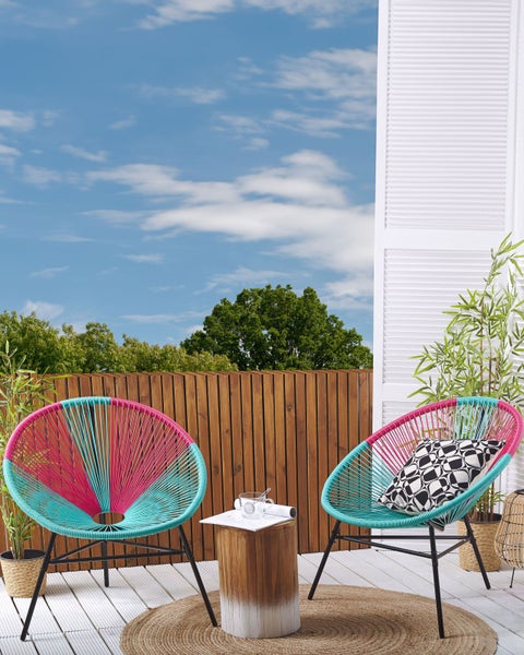 Trendy Spaghetti-Sessel in Rosa und Türkis für den Innen- und Außenbereich. Das fröhliche Set besteht aus 2 bequemen Gartenstühlen. Diese Möbel sind aus einer robusten und besonders pflegeleichten Schnurbespannung aus PE Rattan in Rosa und Türkis gefertigt, kombiniert mit einem stabilen, schwarzen Stahlgestell. In den bequemen und trendy Spaghetti-Sesseln lassen sich heiße Sommertage prima aushalten. Das ausgefallene Design der Schnurbespannung hat einen herrlich luftigen Charakter. Die Stühle sind praktische Begleiter für alle Innen- und Außenbereiche. Fühlen Sie sich wie in Mexiko. Holen Sie sich Urlaubsstimmung und gute Laune in Ihren Garten oder auf Ihren Balkon. Details: Typ Cocktailsessel. Stil: Boho. Farbe: Bunt. Farbton: Türkis. Material: PE Rattan. Material: PE Rattan. Zusätzliches Material: Stahl. Gestellmaterial: Metall. Sitzmaterial: Rattan. Armlehnen: Nein. Finish: Pulverbeschichtet. Zusammenklappbar: Nein. Stapelbar: Ja. Abmessungen: Tiefe: 76 cm. Sitzhöhe: 43 cm. Breite: 76 cm. Höhe: 85 cm. Gewicht: 5 kg. Max. Belastung: 130 kg. .Sie kaufen: 2 x Stühle. Produktvorteile: Niedrige und tiefe Sitzfläche, Entspannte Sitzposition, Geeignet für den Innen- und Aussenbereich, Unkomplizierte Selbstmontage, Schutzkappen zum Schutz des Bodens, Platzsparend stapelbar, Leichtes Gewicht und einfach zu transportieren. Montage: Nicht montiert.20 - 40 Min. Zusatzinformationen: Hinweis! Beschädigungsgefahr! Bitte verwenden Sie keine Messer oder andere spitze oder scharfe Gegenstände, um die Verpackung zu öffnen, da das Produkt sonst beschädigt werden könnte. Um sicherzustellen, dass die Konstruktion stabil und die Nutzungssicherheit gewährleistet ist, sollte man 2 Wochen nach dem Zusammenbau überprüfen, ob die Ware auch korrekt montiert wurde. Außerdem ist alle 3 Monate zu prüfen, ob die Schrauben richtig festgezogen sind. Beständigkeit: Feuchtigkeitsbeständig, Schmutzbeständig, UV-beständig. Beständigkeit Text: UV-strahlenbeständige Möbel weisen eine erhöhte Beständigkeit gegen Verblassen oder Verfärbung auf. Wir empfehlen jedoch, dass Sie das Produkt bei Nichtgebrauch abgedeckt aufbewahren. Dies gewährleistet die maximale Lebensdauer der Möbel. Das Produkt wurde aus Materialien gefertigt, die eine hohe Fleckenbeständigkeit aufweisen, weshalb es zu keinen Verfärbungen kommen sollte oder diese leicht zu beseitigen sind. Bei der Fleckenentfernung sind die Pflegehinweise zu berücksichtigen. Feuchtigkeitsbeständigkeit bedeutet, dass der Artikel leichtem Regenschauer und hoher Luftfeuchtigkeit im Außenbereich standhält. Sollte es nicht möglich sein, ihn drinnen zu lagern, sollte er mit einem Regenschutz abgedeckt werden. Wenn Möbel oder Accessoires längere Zeit Feuchtigkeit ausgesetzt werden, kann dies zu anhaltenden Schäden führen. Pflegeanleitung: PE Rattan: 1.Die Reinigung sollte nur mit handelsüblicher milder Seifenlauge erfolgen. Vermeiden Sie bitte starke chemische Reinigungsmittel. 2.Um die Lebensdauer Ihrer Möbel zu verlängern, setzten Sie das Produkt keiner direkten Sonneneinstrahlung aus. 3.Beachten Sie, dass durch die Lichtreflexion auf Glaselemente, die Kunststoffteile Ihres Produkts beschädigt werden können. 4.Wir empfehlen für die Wintersaison eine Schutzhülle zu verwenden oder, wenn möglich, die Möbel trocken und kühl drinnen zu verwahren. Stahl: 1.Um die Haltbarkeit Ihrer Gartenmöbel zu verlängern, sollten sie stets vor Feuchtigkeit geschützt und regelmäßig gereinigt werden. 2.Die Reinigung kann mit handelsüblicher milder Seifenlauge erfolgen. 3.Um den Korrosionsschutz des Metalls zu gewährleisten, vermeiden Sie den Kontakt mit säurehaltigen Reinigungsmitteln oder Mitteln mit basischen Komponenten. 4.Wenn das Möbelstück nicht verwendet wird, sollte es im Innenbereich gelagert oder mit einer Schutzhülle abgedeckt werden. Dies ist nicht erforderlich, wenn das Möbelstück aus verzinktem Stahl besteht. 5.Falls vorhanden, Schutzkappen in regelmässigen Abständen lösen, etwaige rostigen Ausflüsse austreten lassen, die unbehandelte Innenseite der Gartenmöbel gründlich austrocknen lassen und ev. Korrosionsschutz-Spray verwenden. 6.Jegliche Schäden an der Außenfarbe sollten vor Feuchtigkeit geschützt werden. 7.Bitte beachten Sie, dass dieses Möbelstück nicht mit Wasser in Kontakt kommen sollte, da dadurch rostiges Wasser aus dem Inneren der Rohrrahmen austreten könnte. Diese Hinweise gelten jedoch nicht für Möbel aus verzinktem Stahl, die durch den Verzinkungsprozess eine erhöhte Korrosionsbeständigkeit aufweisen.