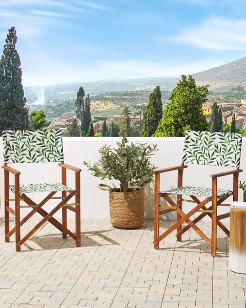 Outdoor-Regiestühle aus Holz mit wechselbaren Stoffbezügen mit dezentem Blättermotiv. Ob im Wohnzimmer oder im Garten platziert – dieses Set wird Ihrem Zuhause garantiert ein Hollywood-Feeling verleihen. Das Gestell ist aus langlebigem und robustem Akazienholz in naturbelassener Ausführung gefertigt, welches den zeitlosen Stil unterstreicht. Im Lieferumfang sind zwei Regiestühle mit jeweils einem Standardbezug in Cremeweiß, sowie 2 zusätzliche farbenfrohe Alternativstoffe mit Blattmuster enthalten. So haben Sie die Möglichkeit, die Sitzgelegenheiten nach Belieben zu verändern und für Abwechslung zu sorgen. Wenn Sie die Stühle Mal nicht brauchen, können Sie sie leicht zusammenklappen und so Platz sparen. Details: Typ Gartenstuhl. Farbe: Grün. Material: Holz. Material: Stoff. Gestellmaterial: Holz. Sitzmaterial: Stoff. Zusammenstellung: 100% Polyester. Armlehnen: Ja. Finish: Geölt. Zusammenklappbar: Ja. Stapelbar: Nein. Abmessungen: Höhe Armlehnen: 64 cm. Tiefe: 50 cm. Sitzhöhe: 48 cm. Breite: 50 cm. Höhe: 91 cm. Sitzfläche: 44x46 cm. Gewicht: 4 kg. Max. Belastung: 120 kg. .Sie kaufen: 4 x Stoffbezug, 2 x Stühle. Produktvorteile: Inklusive wechselbarer Stoffbezug, Moderne Terrassen- und Gartenmöbel, UV-Beständigkeit Klasse 4 (ISO 105-B02), Damit die Qualität des Artikels erhalten bleibt, sollte er vor Wasser und Regen geschützt werden, Platzsparend zusammenklappbar, Natürliche Materialien. Montage: Teilweise montiert.20 - 40 Min. Zusatzinformationen: Damit das folgende Produkt jahrelang seine Schönheit beibehält, stellen wir Ihnen ein ausführliches Pflegehandbuch zur Verfügung. Die Pflegeanleitung und Tipps zur richtigen Wartung Ihres neuen Produkts finden Sie finden Sie unten im Abschnitt „Verpackung und Montage“. Holz ist ein Naturprodukt. Farb- und Strukturunterschiede, Narben, Falten und sonstige Naturmerkmale sind Echtheitsbeweise und keine zur Reklamation berechtigende Fehler. Beständigkeit: Feuchtigkeitsbeständig, UV-beständig. Beständigkeit Text: UV-strahlenbeständige Möbel weisen eine erhöhte Beständigkeit gegen Verblassen oder Verfärbung auf. Wir empfehlen jedoch, dass Sie das Produkt bei Nichtgebrauch abgedeckt aufbewahren. Dies gewährleistet die maximale Lebensdauer der Möbel. Feuchtigkeitsbeständigkeit bedeutet, dass der Artikel leichtem Regenschauer und hoher Luftfeuchtigkeit im Außenbereich standhält. Sollte es nicht möglich sein, ihn drinnen zu lagern, sollte er mit einem Regenschutz abgedeckt werden. Wenn Möbel oder Accessoires längere Zeit Feuchtigkeit ausgesetzt werden, kann dies zu anhaltenden Schäden führen. Pflegeanleitung: Akazienholz: 1.Bitte ausschließlich milde Reinigungsmittel und weiche Tücher verwenden. Dabei immer in Richtung der Maserung abwischen. Feuchte Stellen sofort mit einem weichen Tuch trocken reiben und Dauernässe bei der Reinigung vermeiden. 2.Geöltes Holz sollte vor der Benutzung und nach der Saison vor der Einlagerung nachgeölt werden, besonders bei feuchtem Klima. 3.Wir empfehlen bei ungünstigen Witterungsbedingungen und für die Wintersaison eine Schutzabdeckung zu verwenden oder, wenn möglich, die Gartenmöbel trocken und kühl drinnen zu lagern. Stoff: 1.Nur von Hand, mit kaltem Wasser und milden Reinigungsmitteln auf der rechten Seite mit geschlossenem Reißverschluss waschen. 2.Bitte nicht im Trockner trocknen und auch nicht bügeln, 3.Wenn die Textilien nicht verwendet werden, sollten sie an einem sauberen und trockenen Ort vor ungünstigen Witterungseinflüssen geschützt werden.