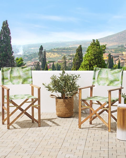 Outdoor-Regiestühle aus Holz mit wechselbaren Stoffbezügen mit Blättermotiv. Ob im Wohnzimmer oder im Garten platziert – dieses Set wird Ihrem Zuhause garantiert ein Hollywood-Feeling verleihen. Das Gestell ist aus langlebigem und robustem Akazienholz in naturbelassener Ausführung gefertigt, welches den zeitlosen Stil unterstreicht. Im Lieferumfang sind zwei Regiestühle mit jeweils einem Standardbezug in Grau, sowie 2 zusätzliche farbenfrohe Alternativstoffe mit Palmenmotiv enthalten. So haben Sie die Möglichkeit, die Sitzgelegenheiten nach Belieben zu verändern und für Abwechslung zu sorgen. Wenn Sie die Stühle Mal nicht brauchen, können Sie sie leicht zusammenklappen und so Platz sparen. Details: Typ Gartenstuhl. Farbe: Braun. Farbton: Hellgrün. Material: Holz. Material: Stoff. Gestellmaterial: Holz. Sitzmaterial: Stoff. Zusammenstellung: 100% Polyester. Armlehnen: Ja. Finish: Geölt. Zusammenklappbar: Ja. Stapelbar: Nein. Abmessungen: Höhe Armlehnen: 64 cm. Tiefe: 50 cm. Sitzhöhe: 48 cm. Breite: 50 cm. Höhe: 91 cm. Sitzfläche: 44x46 cm. Gewicht: 4 kg. Max. Belastung: 120 kg. .Sie kaufen: 4 x Stoffbezug, 2 x Stühle. Produktvorteile: Inklusive wechselbarer Stoffbezug, Moderne Terrassen- und Gartenmöbel, UV-Beständigkeit Klasse 4 (ISO 105-B02), Damit die Qualität des Artikels erhalten bleibt, sollte er vor Wasser und Regen geschützt werden, Platzsparend zusammenklappbar, Natürliche Materialien. Montage: Teilweise montiert.20 - 40 Min. Zusatzinformationen: Damit das folgende Produkt jahrelang seine Schönheit beibehält, stellen wir Ihnen ein ausführliches Pflegehandbuch zur Verfügung. Die Pflegeanleitung und Tipps zur richtigen Wartung Ihres neuen Produkts finden Sie finden Sie unten im Abschnitt „Verpackung und Montage“. Holz ist ein Naturprodukt. Farb- und Strukturunterschiede, Narben, Falten und sonstige Naturmerkmale sind Echtheitsbeweise und keine zur Reklamation berechtigende Fehler. Beständigkeit: Feuchtigkeitsbeständig, UV-beständig. Beständigkeit Text: UV-strahlenbeständige Möbel weisen eine erhöhte Beständigkeit gegen Verblassen oder Verfärbung auf. Wir empfehlen jedoch, dass Sie das Produkt bei Nichtgebrauch abgedeckt aufbewahren. Dies gewährleistet die maximale Lebensdauer der Möbel. Feuchtigkeitsbeständigkeit bedeutet, dass der Artikel leichtem Regenschauer und hoher Luftfeuchtigkeit im Außenbereich standhält. Sollte es nicht möglich sein, ihn drinnen zu lagern, sollte er mit einem Regenschutz abgedeckt werden. Wenn Möbel oder Accessoires längere Zeit Feuchtigkeit ausgesetzt werden, kann dies zu anhaltenden Schäden führen. Pflegeanleitung: Akazienholz: 1.Bitte ausschließlich milde Reinigungsmittel und weiche Tücher verwenden. Dabei immer in Richtung der Maserung abwischen. Feuchte Stellen sofort mit einem weichen Tuch trocken reiben und Dauernässe bei der Reinigung vermeiden. 2.Geöltes Holz sollte vor der Benutzung und nach der Saison vor der Einlagerung nachgeölt werden, besonders bei feuchtem Klima. 3.Wir empfehlen bei ungünstigen Witterungsbedingungen und für die Wintersaison eine Schutzabdeckung zu verwenden oder, wenn möglich, die Gartenmöbel trocken und kühl drinnen zu lagern. Stoff: 1.Nur von Hand, mit kaltem Wasser und milden Reinigungsmitteln auf der rechten Seite mit geschlossenem Reißverschluss waschen. 2.Bitte nicht im Trockner trocknen und auch nicht bügeln, 3.Wenn die Textilien nicht verwendet werden, sollten sie an einem sauberen und trockenen Ort vor ungünstigen Witterungseinflüssen geschützt werden.