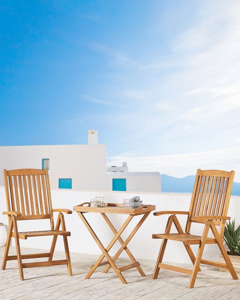 Zusammenklappbares Holzstuhl 2er Set mit verstellbaren Rückenlehnen. Die Stühle sind leicht zu transportieren und lassen sich schnell an Ihrem Lieblingsplatz in der Sonne aufstellen. Zudem sind sie zur einfachen Aufbewahrung vollständig zusammenklappbar. Das Set ist aus langlebigem Akazienholz hergestellt. Dieses Hartholz besticht mit seiner natürlichen Schönheit und vermittelt ein Freizeitwohnen auf hohem Niveau. Dem enorm stabilen Akazie Plantagenhartholz kann so leicht nichts anhaben: Regen, Sonne und Kälte sind kein Problem auch bei minimaler Pflege. Details: Typ Esszimmerstuhl. Stil: Mediterran. Farbe: Braun. Material: Holz. Material: Akazienholz. Gestellmaterial: Holz. Sitzmaterial: Holz. Verstellbar: Rückenlehne. Armlehnen: Ja. Finish: Geölt. Zusammenklappbar: Ja. Stapelbar: Nein. Abmessungen: Höhe Armlehnen: 67 cm. Tiefe: 69 cm. Sitzhöhe: 44 cm. Breite: 54 cm. Höhe: 105 cm. Sitzfläche: 48x43 cm. Gewicht: 9 kg. Max. Belastung: 160 kg. .Sie kaufen: 2 x Stühle. Produktvorteile: Perfekt geformte Armlehnen, Qualitativ hochwertiges Material, Geeignet für den Innen- und Aussenbereich, Damit die Qualität des Artikels erhalten bleibt, sollte er vor Wasser und Regen geschützt werden, Platzsparend zusammenklappbar, Regulierbare Rückenlehne. Montage: Benötigt keine Montage. Zusatzinformationen: Damit das folgende Produkt jahrelang seine Schönheit beibehält, stellen wir Ihnen ein ausführliches Pflegehandbuch zur Verfügung. Die Pflegeanleitung und Tipps zur richtigen Wartung Ihres neuen Produkts finden Sie finden Sie unten im Abschnitt „Verpackung und Montage“. Holz ist ein Naturprodukt. Farb- und Strukturunterschiede, Narben, Falten und sonstige Naturmerkmale sind Echtheitsbeweise und keine zur Reklamation berechtigende Fehler. Beständigkeit: Feuchtigkeitsbeständig, Schmutzbeständig. Beständigkeit Text: Das Produkt wurde aus Materialien gefertigt, die eine hohe Fleckenbeständigkeit aufweisen, weshalb es zu keinen Verfärbungen kommen sollte oder diese leicht zu beseitigen sind. Bei der Fleckenentfernung sind die Pflegehinweise zu berücksichtigen. Feuchtigkeitsbeständigkeit bedeutet, dass der Artikel leichtem Regenschauer und hoher Luftfeuchtigkeit im Außenbereich standhält. Sollte es nicht möglich sein, ihn drinnen zu lagern, sollte er mit einem Regenschutz abgedeckt werden. Wenn Möbel oder Accessoires längere Zeit Feuchtigkeit ausgesetzt werden, kann dies zu anhaltenden Schäden führen. Pflegeanleitung: Akazienholz: 1.Bitte ausschließlich milde Reinigungsmittel und weiche Tücher verwenden. Dabei immer in Richtung der Maserung abwischen. Feuchte Stellen sofort mit einem weichen Tuch trocken reiben und Dauernässe bei der Reinigung vermeiden. 2.Geöltes Holz sollte vor der Benutzung und nach der Saison vor der Einlagerung nachgeölt werden, besonders bei feuchtem Klima. 3.Wir empfehlen bei ungünstigen Witterungsbedingungen und für die Wintersaison eine Schutzabdeckung zu verwenden oder, wenn möglich, die Gartenmöbel trocken und kühl drinnen zu lagern.