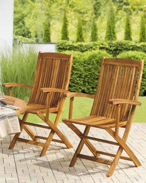 Exklusive Gartenstühle mit bequemen Armlehnen aus edlem Akazienholz. Die Sessel unter den Gartenstühlen. Diese Gartenstühle mit bequemen Armlehnen sind eine ganz besonders exklusive Ergänzung für Ihren Garten, Terrasse oder Balkon. Optimaler Sitzkomfort und elegante Optik sind sehr charakteristisch für diesen Set ebenso wie hochwertiges Material. Die breiten Armlehnen bieten extra Komfort. Das edle Akazienholz mit seiner wunderschönen, warmen Farbe ist extrem beständig und pflegeleicht. Selbstverständlich lassen sich die Stühle platzsparend zusammenklappen. Details: Typ Gartenstuhl. Farbe: Braun. Material: Holz. Material: Akazienholz. Gestellmaterial: Holz. Sitzmaterial: Holz. Armlehnen: Ja. Finish: Geölt. Zusammenklappbar: Ja. Stapelbar: Nein. Abmessungen: Höhe Armlehnen: 65 cm. Tiefe: 48 cm. Sitzhöhe: 43 cm. Breite: 42 cm. Höhe: 93 cm. Sitzfläche: 40x38 cm. Gewicht: 9 kg. Max. Belastung: 130 kg. .Sie kaufen: 2 x Stühle. Produktvorteile: Bequem geformte Armlehnen, Speziell für die Nutzung im Außenbereich entworfen, Stabile Verarbeitung, Herstellung aus natürlich widerstandsfähigen Materialien, Damit die Qualität des Artikels erhalten bleibt, sollte er vor Wasser und Regen geschützt werden, Platzsparend zusammenklappbar. Montage: Benötigt keine Montage. Zusatzinformationen: Damit das folgende Produkt jahrelang seine Schönheit beibehält, stellen wir Ihnen ein ausführliches Pflegehandbuch zur Verfügung. Die Pflegeanleitung und Tipps zur richtigen Wartung Ihres neuen Produkts finden Sie finden Sie unten im Abschnitt „Verpackung und Montage“. Holz ist ein Naturprodukt. Farb- und Strukturunterschiede, Narben, Falten und sonstige Naturmerkmale sind Echtheitsbeweise und keine zur Reklamation berechtigende Fehler. Beständigkeit: Feuchtigkeitsbeständig, Schmutzbeständig. Beständigkeit Text: Das Produkt wurde aus Materialien gefertigt, die eine hohe Fleckenbeständigkeit aufweisen, weshalb es zu keinen Verfärbungen kommen sollte oder diese leicht zu beseitigen sind. Bei der Fleckenentfernung sind die Pflegehinweise zu berücksichtigen. Feuchtigkeitsbeständigkeit bedeutet, dass der Artikel leichtem Regenschauer und hoher Luftfeuchtigkeit im Außenbereich standhält. Sollte es nicht möglich sein, ihn drinnen zu lagern, sollte er mit einem Regenschutz abgedeckt werden. Wenn Möbel oder Accessoires längere Zeit Feuchtigkeit ausgesetzt werden, kann dies zu anhaltenden Schäden führen. Pflegeanleitung: Akazienholz: 1.Bitte ausschließlich milde Reinigungsmittel und weiche Tücher verwenden. Dabei immer in Richtung der Maserung abwischen. Feuchte Stellen sofort mit einem weichen Tuch trocken reiben und Dauernässe bei der Reinigung vermeiden. 2.Geöltes Holz sollte vor der Benutzung und nach der Saison vor der Einlagerung nachgeölt werden, besonders bei feuchtem Klima. 3.Wir empfehlen bei ungünstigen Witterungsbedingungen und für die Wintersaison eine Schutzabdeckung zu verwenden oder, wenn möglich, die Gartenmöbel trocken und kühl drinnen zu lagern.