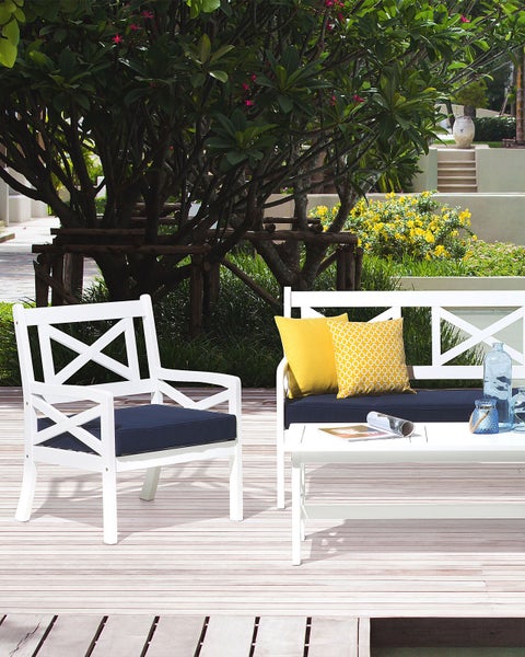 Gemütlicher Gartenstuhl aus Akazienholz mit maritimer Ausstrahlung. Der bequeme, breite Gartenstuhl mit Armlehnen bietet optimalen Sitzkomfort und lädt zu entspannten Stunden in der Sonne ein. Das angenehm gepolsterte Sitzkissen hat einen beständigen, schmutzabweisenden, abnehm- und waschbaren Polyesterbezug. Die offene Struktur der gekreuzten Streben und die klassische Kombination aus strahlendem Weiß und Marineblau verleiht diesem Stuhl seine maritime Ausstrahlung. Details: Typ Gartenstuhl. Stil: Modern. Farbe: Weiß. Material: Holz. Material: Akazienholz. Zusätzliches Material: Stoff. Gestellmaterial: Holz. Sitzmaterial: Stoff. Zusammenstellung: 100% Polyester. Armlehnen: Ja. Finish: Geölt. Zusammenklappbar: Nein. Schaumstoffdichte: 18 kg/m3. Stapelbar: Nein. Abmessungen: Höhe Armlehnen: 60 cm. Tiefe: 69 cm. Dicke der Polsterauflagen: 10 cm. Sitzhöhe: 44 cm. Breite: 65 cm. Höhe: 90 cm. Sitzfläche: 59x59 cm. Gewicht: 22 kg. Max. Belastung: 130 kg. .Sie kaufen: 1 x Stuhl, 1 x Sitzkissen. Produktvorteile: Dicke Polsterung für grössten Komfort, Minimalistischer, skandinavischer Stil, Speziell für die Nutzung im Außenbereich entworfen, Witterungsbeständiges Material, UV-Beständigkeit Klasse 4 (ISO 105-B02), Damit die Qualität des Artikels erhalten bleibt, sollte er vor Wasser und Regen geschützt werden, Leicht transportierbar. Montage: Teilweise montiert.5 - 15 Min. Zusatzinformationen: Damit das folgende Produkt jahrelang seine Schönheit beibehält, stellen wir Ihnen ein ausführliches Pflegehandbuch zur Verfügung. Die Pflegeanleitung und Tipps zur richtigen Wartung Ihres neuen Produkts finden Sie finden Sie unten im Abschnitt „Verpackung und Montage“. Holz ist ein Naturprodukt. Farb- und Strukturunterschiede, Narben, Falten und sonstige Naturmerkmale sind Echtheitsbeweise und keine zur Reklamation berechtigende Fehler. Beständigkeit: Feuchtigkeitsbeständig, UV-beständig. Beständigkeit Text: Feuchtigkeitsbeständigkeit bedeutet, dass der Artikel leichtem Regenschauer und hoher Luftfeuchtigkeit im Außenbereich standhält. Sollte es nicht möglich sein, ihn drinnen zu lagern, sollte er mit einem Regenschutz abgedeckt werden. Wenn Möbel oder Accessoires längere Zeit Feuchtigkeit ausgesetzt werden, kann dies zu anhaltenden Schäden führen. Dieser Artikel ist aus solchen Stoffen gefertigt, die im Vergleich zu Standardgeweben über eine stärkere UV-Beständigkeit verfügen und somit eine höhere Farbbeständigkeit aufweisen. Trotzdem sollte man das Produkt bei Nichtgebrauch abgedeckt aufbewahren, um seine Lebensdauer zu verlängern. Pflegeanleitung: Akazienholz: 1.Bitte ausschließlich milde Reinigungsmittel und weiche Tücher verwenden. Dabei immer in Richtung der Maserung abwischen. Feuchte Stellen sofort mit einem weichen Tuch trocken reiben und Dauernässe bei der Reinigung vermeiden. 2.Geöltes Holz sollte vor der Benutzung und nach der Saison vor der Einlagerung nachgeölt werden, besonders bei feuchtem Klima. 3.Wir empfehlen bei ungünstigen Witterungsbedingungen und für die Wintersaison eine Schutzabdeckung zu verwenden oder, wenn möglich, die Gartenmöbel trocken und kühl drinnen zu lagern. Stoff: 1.Sofern vom Hersteller nicht anders vorgegeben, bitte auf der rechten Seite mit geschlossenem Reißverschluss in einem Feinwäsche-Programm oder per Handwäsche bei max. 30°C waschen. 2.Bitte nicht im Trockner trocknen und auch nicht bügeln, 3.Wenn die Textilien nicht verwendet werden, sollten sie an einem sauberen und trockenen Ort vor ungünstigen Witterungseinflüssen geschützt werden.