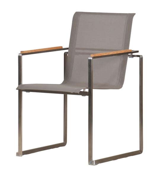 Die Brücke zwischen klassisch-bewährtem Design und moderner Optik schlägt dieser Teak Edelstahl Gartenstuhl gekonnt. Dank der zeitgemäßen Materialien und Farben passt er hervorragend in moderne Gärten. Das Gestell des Edelstahl Gartenstuhls besteht aus gebürstetem Edelstahl, welcher absolut witterungsresistent und rostfrei ist. Derweil sind Sitzfläche und Rückenlehne mit einem strapazierfähigen Kunsttextil bespannt. Dieses gibt leicht nach, ohne auszuleiern, sodass Sie von einem herausragenden Sitzkomfort profitieren. Die feinen Teak-Applikationen an den Armlehnen stellen einen tollen Übergang zu Gartentischen aus Teakholz her. Ein schöner Nebeneffekt ist, dass Sie sich nicht an den vom Sonnenlicht aufgeheizten Armlehnen verbrennen werden, da Teakholz kaum Wärme leitet. Hinzu kommt, dass unsere Teak Edelstahl Gartenmöbel geschickt ineinander stapelbar und somit platzsparend zu verstauen sind. Trotz ihrer robusten Konstruktion müssen Sie sich keine Gedanken um verkratzte Böden machen, da die Stuhlbeine mit Kunststoffgleitern versehen sind. Genießen Sie unbeschwerte Freiluftmomente!