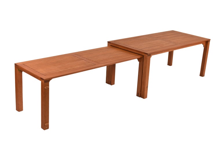 Der Tisch mit dem Grundmaß von 185 x 90 cm lässt sich bei Bedarf um einen zweiten Tisch mit den Maßen von 185 x 73 cm erweitern. Den zweiten Tisch können Sie unter dem ersten Tisch heraussiehen und die Länge des Tisches somit flexibel gestalten. Im komplett ausgezogenen Zustand ergibt sich eine Gesamtlänge von 370 cm. Alternativ können Sie die Tische auch separat voneinander aufstellen.