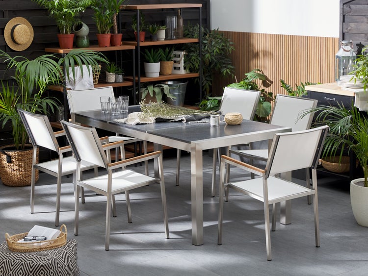 Edelstahltisch mit schwarzer Steinplatte. Dieser Esstisch aus wertvollem Edelstahl und schwarzem, geflammtem Granit ist ein ganz außergewöhnliches Modell in unserer Produktepallette. Diese Materialien bilden eine Kombination, welche an Robustheit und Eleganz kaum zu übertreffen ist. Der glänzende Rahmen aus gebürstetem Edelstahl ist äußerst robust und beständig. Die dreifach geteilte Granitplatte ist perfekt verarbeitet und bildet eine sehr stabile Tischoberfläche an der bis zu 6 Personen Platz finden können. Dank den hochwertigen Materialien ist der Gartentisch sehr pflegeleicht und trotzt jedem Wetter, egal ob im Sommer oder Winter. Details: Typ Gartentisch. Stil: Industriell. Farbe: Grau. Farbton: Graphitgrau. Material: Stein. Material: Granit. Zusätzliches Material: Edelstahl. Gestellmaterial: Metall. Tischplattenmaterial: Stein. Form: Rechteckig. Finish: Gebürstet. Anzahl Sitzplätze: 6 Personen. Abmessungen: Breite: 90 cm. Länge: 180 cm. Höhe: 74 cm. Gewicht: 101 kg. Max. Belastung: 70 kg. .Sie kaufen: 1 x Tisch. Produktvorteile: Moderne Terrassen- und Gartenmöbel, Schmutzabweisend, UV-Beständigkeit, Korrosionsfreies Gestell, Wasserdicht dank hochwertiger Materialien, Unkomplizierte Selbstmontage. Montage: Nicht montiert.20 - 40 Min. Zusatzinformationen: Damit das folgende Produkt jahrelang seine Schönheit beibehält, stellen wir Ihnen ein ausführliches Pflegehandbuch zur Verfügung. Die Pflegeanleitung und Tipps zur richtigen Wartung Ihres neuen Produkts finden Sie finden Sie unten im Abschnitt „Verpackung und Montage“. Beständigkeit: Windbeständig, Wasserbeständig, Schmutzbeständig, UV-beständig, Rostbeständig. Beständigkeit Text: UV-strahlenbeständige Möbel weisen eine erhöhte Beständigkeit gegen Verblassen oder Verfärbung auf. Wir empfehlen jedoch, dass Sie das Produkt bei Nichtgebrauch abgedeckt aufbewahren. Dies gewährleistet die maximale Lebensdauer der Möbel. Das Produkt wurde aus Materialien gefertigt, die eine hohe Fleckenbeständigkeit aufweisen, weshalb es zu keinen Verfärbungen kommen sollte oder diese leicht zu beseitigen sind. Bei der Fleckenentfernung sind die Pflegehinweise zu berücksichtigen. Dank eines entsprechenden Finish zeichnet sich das Produkt Oberfläche durch eine Rostbeständigkeit aus. Dies bedeutet, dass es im Freien genutzt werden kann. Werden die Möbel nicht genutzt, sollte entweder eine Abdeckung verwendet oder sie sollten an einem trockenen Ort gelagert werden. Dieses Produkt besitzt eine hohe Windbeständigkeit, weshalb es nicht umkippen oder seine Stabilität aufgrund von Windböen verlieren sollte. Dieses Produkt zeichnet sich durch eine hohe Wasserbeständigkeit aus. Dies bedeutet, dass es in Kontakt mit Regen oder anderen Flüssigkeiten nicht beschädigt wird. Sie können das Produkt im Freien, auch bei Regen oder einer hohen Luftfeuchtigkeit nutzen. Außerhalb der Saison sollte das Produkt bedeckt und an einer abgedachten Stelle aufbewahrt werden. Pflegeanleitung: Granit: 1.Verwenden Sie ausschliesslich milde Reinigungsmittel oder spezielle Pflegemittel für Granit, niemals scheuernden Reinigungsprodukte. 2.Nach der Reinigung mit einem weichen, trockenen Tuch nachreiben. 3.Hartnäckige Flecken (z.B. Öl, Ketchup, Rotwein) sollten Sie umgehend entfernen, damit sie nicht in den Stein eindringen können. 4.Wir empfehlen für die Wintersaison eine Schutzhülle zu verwenden oder, wenn möglich, die Möbel trocken und kühl drinnen zu lagern. Edelstahl: 1.Verwenden Sie bitte ausschließlich milde Reinigungsmittel und vermeiden Sie den Kontakt mit säurehaltigen Reinigungsmitteln oder Mitteln mit basischen Komponenten. 2.Das Produkt ist aus Edehlstahl gefertigt. Bei starken Regenfällen ist der Regenschutz zu empfehlen. 3.Saurer Regen, Salzwasser sowie starker Sandwind beschädigen die Schutzbeschichtung. 4.Wir empfehlen für die Wintersaison eine Schutzhülle zu verwenden oder, wenn möglich, die Gartenmöbel trocken und kühl drinnen zu lagern.