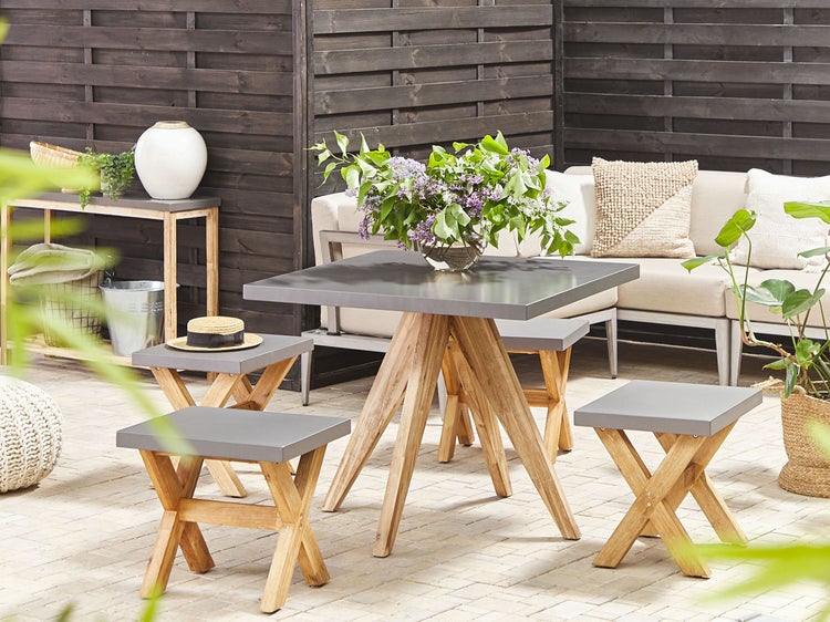 Esstisch für den Außenbereich mit Akazienholzfuß. Dieser Tisch verleiht Ihrem Garten ein ganz besonderes Aussehen und macht das Essen mit Verwandten oder Freunden viel gemütlicher. Seine Tischplatte aus Betonfasern eignet sich perfekt für den Außenbereich, da sie leicht zu reinigen als auch zu pflegen ist und verschiedenen Wetterbedingungen standhält. Die lamienierten Beine aus Akazienholz in hellem, natürlichem Look sorgen für die Standfestigkeit der Konstruktion und setzen einen auffälligen Akzent im Kontrast zur grauen Platte. Er passt sicher in einen Garten, der in modernem oder minimalistischem Design eingerichtet ist. Details: Typ Gartentisch. Stil: Industriell. Farbe: Grau. Material: Beton. Material: Faserzement. Zusätzliches Material: Akazienholz. Gestellmaterial: Holz. Tischplattenmaterial: Beton. Form: Quadratisch. Finish: Laminiert. Anzahl Sitzplätze: 4 Personen. Abmessungen: Breite: 90 cm. Länge: 90 cm. Höhe: 76 cm. Gewicht: 39 kg. Max. Belastung: 150 kg. .Sie kaufen: 1 x Tisch. Produktvorteile: Passt wunderbar zu jedem Einrichtungsstil, Minimalistischer, skandinavischer Stil, Stabile und solide Konstruktion, Hochwertiges Material, Witterungsbeständiges Material, Schutzkappen zum Schutz des Bodens. Montage: Nicht montiert.5 - 15 Min. Zusatzinformationen: Damit das folgende Produkt jahrelang seine Schönheit beibehält, stellen wir Ihnen ein ausführliches Pflegehandbuch zur Verfügung. Die Pflegeanleitung und Tipps zur richtigen Wartung Ihres neuen Produkts finden Sie finden Sie unten im Abschnitt „Verpackung und Montage“. Die Möbel können abhängig von der Luftfeuchtigkeit mit der Zeit Porenlöcher, feine Risse und Unregelmässigkeiten in der Färbung aufweisen, dies liegt in der Natur des Materials und macht den eigentlichen Charme des Möbels aus. Dies hat keinen Einfluss auf die Stabilität, sondern es ist eine reine optische Veränderung. Beständigkeit: Feuchtigkeitsbeständig, Windbeständig, UV-beständig, Rostbeständig. Beständigkeit Text: UV-strahlenbeständige Möbel weisen eine erhöhte Beständigkeit gegen Verblassen oder Verfärbung auf. Wir empfehlen jedoch, dass Sie das Produkt bei Nichtgebrauch abgedeckt aufbewahren. Dies gewährleistet die maximale Lebensdauer der Möbel. Feuchtigkeitsbeständigkeit bedeutet, dass der Artikel leichtem Regenschauer und hoher Luftfeuchtigkeit im Außenbereich standhält. Sollte es nicht möglich sein, ihn drinnen zu lagern, sollte er mit einem Regenschutz abgedeckt werden. Wenn Möbel oder Accessoires längere Zeit Feuchtigkeit ausgesetzt werden, kann dies zu anhaltenden Schäden führen. Dank eines entsprechenden Finish zeichnet sich das Produkt Oberfläche durch eine Rostbeständigkeit aus. Dies bedeutet, dass es im Freien genutzt werden kann. Werden die Möbel nicht genutzt, sollte entweder eine Abdeckung verwendet oder sie sollten an einem trockenen Ort gelagert werden. Dieses Produkt besitzt eine hohe Windbeständigkeit, weshalb es nicht umkippen oder seine Stabilität aufgrund von Windböen verlieren sollte. Pflegeanleitung: Faserzement: 1.Nicht mit säurehaltigen, scheuernden oder fettigen Reinigungsmitteln behandeln, da diese Spuren hinterlassen können. 2.Wir empfehlen für die Wintersaison eine Schutzhülle zu verwenden oder, wenn möglich, die Möbel trocken und kühl drinnen zu lagern. 3.Betonmöbel sollten vor starkem Regen geschützt werden. Akazienholz: 1.Bitte ausschließlich milde Reinigungsmittel und weiche Tücher verwenden. Dabei immer in Richtung der Maserung abwischen. Feuchte Stellen sofort mit einem weichen Tuch trocken reiben und Dauernässe bei der Reinigung vermeiden. 2.Geöltes Holz sollte vor der Benutzung und nach der Saison vor der Einlagerung nachgeölt werden, besonders bei feuchtem Klima. 3.Wir empfehlen bei ungünstigen Witterungsbedingungen und für die Wintersaison eine Schutzabdeckung zu verwenden oder, wenn möglich, die Gartenmöbel trocken und kühl drinnen zu lagern.