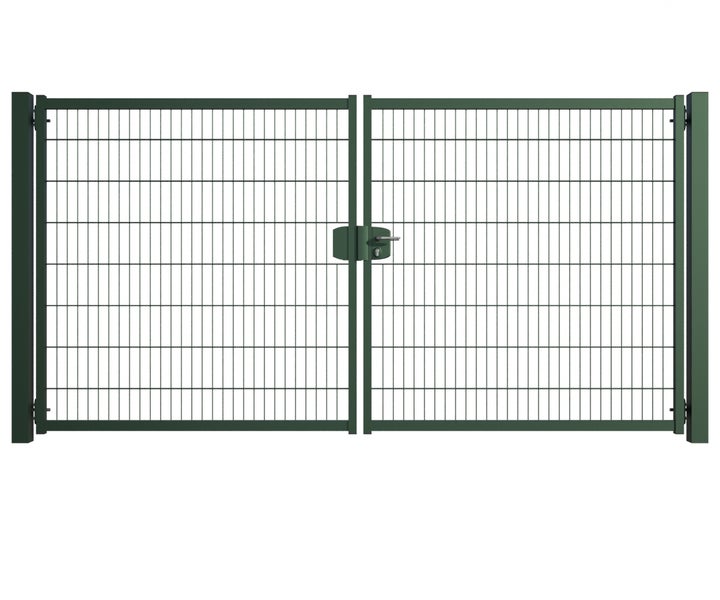 Gartentor ZAUNGURU BASIC-Line Berlin aus Metall, Höhe: 163cm, Breite: 334cm, 2-flügelig inkl. Pfosten, Schloss und Zubehör, Feuerverzinkt und zusätzlich in RAL 6005 Moosgrün pulverbeschichtet