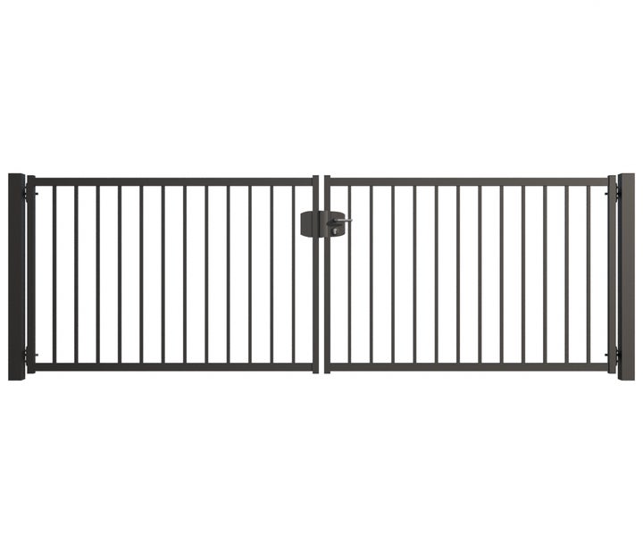 Gartentor ZAUNGURU BASIC-Line Bremen aus Metall, Höhe: 123cm, Breite: 388cm, 2-flügelig inkl. Pfosten, Schloss und Zubehör, Feuerverzinkt und zusätzlich in RAL 7016 Anthrazitgrau pulverbeschichtet