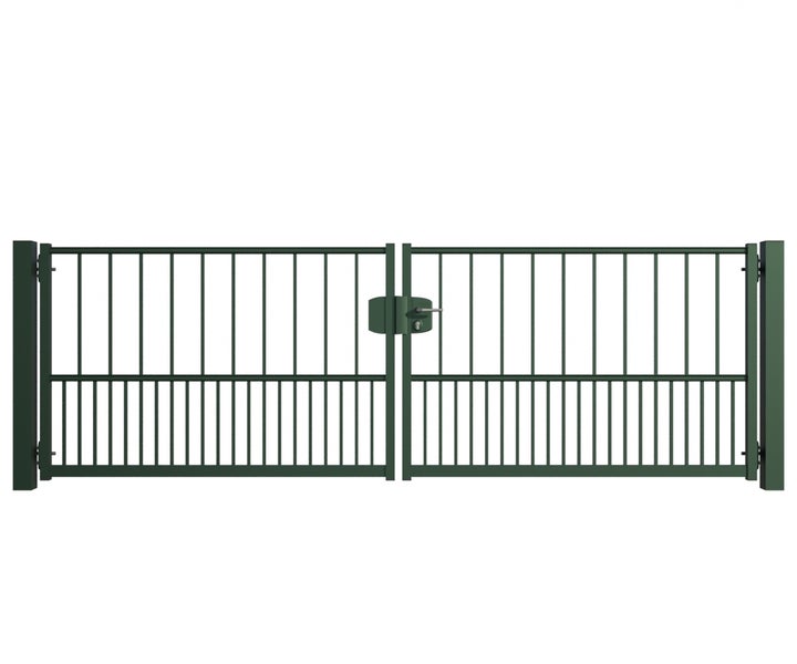 Gartentor ZAUNGURU BASIC-Line Hamburg aus Metall, Höhe: 103cm, Breite: 334cm, 2-flügelig inkl. Pfosten, Schloss und Zubehör, Feuerverzinkt und zusätzlich in RAL 6005 Moosgrün pulverbeschichtet