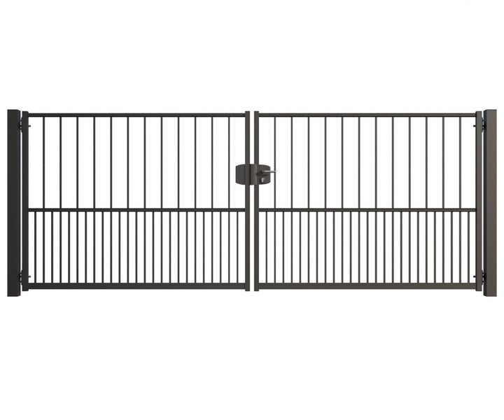 Gartentor ZAUNGURU BASIC-Line Hamburg aus Metall, Höhe: 143cm, Breite: 388cm, 2-flügelig inkl. Pfosten, Schloss und Zubehör, Feuerverzinkt und zusätzlich in RAL 7016 Anthrazitgrau pulverbeschichtet