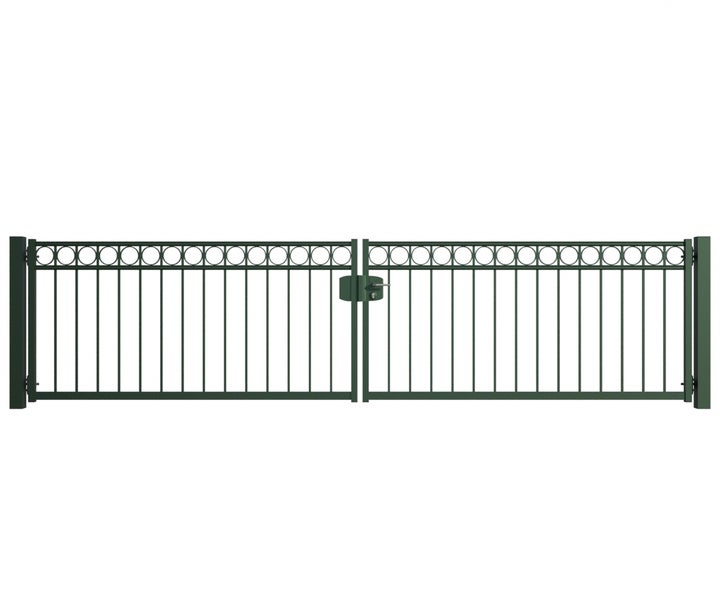 Gartentor ZAUNGURU BASIC-Line Oldenburg Kreis aus Metall, Höhe: 103cm, Breite: 441cm, 2-flügelig inkl. Pfosten, Schloss und Zubehör, Feuerverzinkt und zusätzlich in RAL 6005 Moosgrün pulverbeschichtet