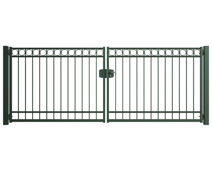 Gartentor ZAUNGURU BASIC-Line Oldenburg Kreis aus Metall, Höhe: 143cm, Breite: 388cm, 2-flügelig inkl. Pfosten, Schloss und Zubehör, Feuerverzinkt und zusätzlich in RAL 6005 Moosgrün pulverbeschichtet
