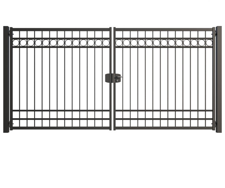 Gartentor ZAUNGURU BASIC-Line Oldenburg Kreis aus Metall, Höhe: 183cm, Breite: 388cm, 2-flügelig inkl. Pfosten, Schloss und Zubehör, Feuerverzinkt und zusätzlich in RAL 7016 Anthrazitgrau pulverbeschichtet
