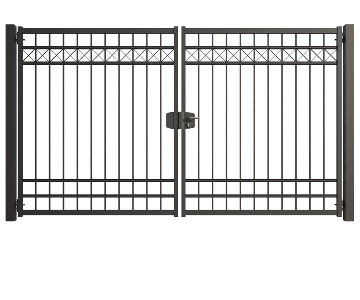 Gartentor ZAUNGURU BASIC-Line Oldenburg Kreuz aus Metall, Höhe: 183cm, Breite: 334cm, 2-flügelig inkl. Pfosten, Schloss und Zubehör, Feuerverzinkt und zusätzlich in RAL 7016 Anthrazitgrau pulverbeschichtet