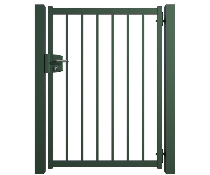 Gartentor ZAUNGURU BASIC-Linie Bremen aus Metall, Höhe: 143cm, Breite: 123cm, 1-flügelig inkl. Pfosten, Schloss und Zubehör, Feuerverzinkt und zusätzlich in RAL 6005 Moosgrün pulverbeschichtet