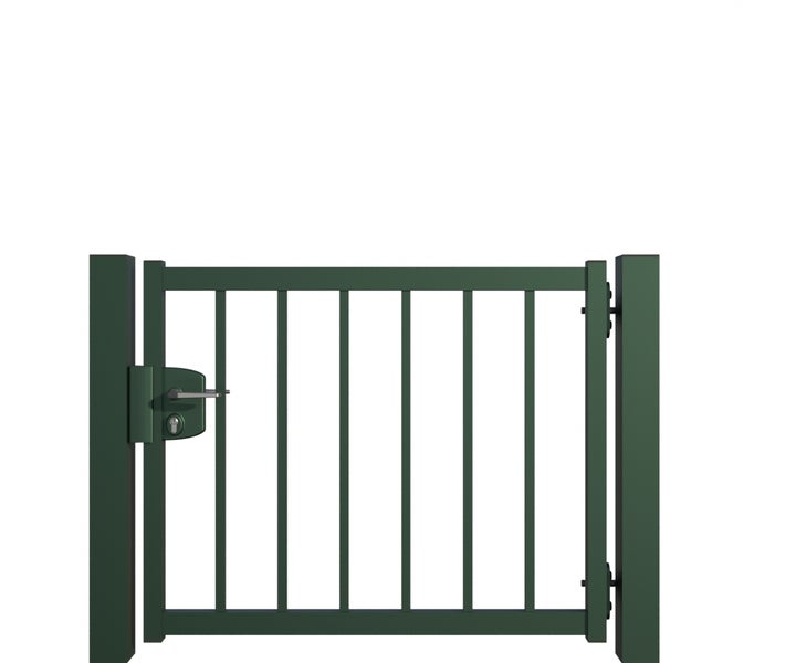 Gartentor ZAUNGURU BASIC-Linie Bremen aus Metall, Höhe: 83cm, Breite: 123cm, 1-flügelig inkl. Pfosten, Schloss und Zubehör, Feuerverzinkt und zusätzlich in RAL 6005 Moosgrün pulverbeschichtet