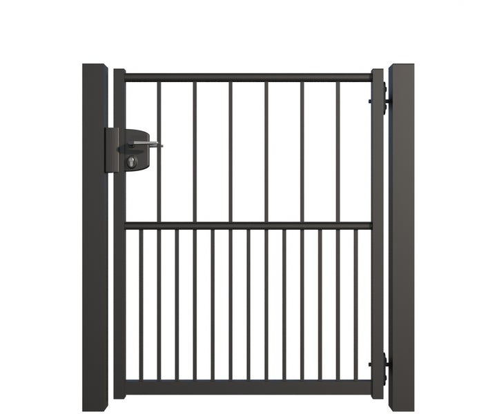 Gartentor ZAUNGURU BASIC-Linie Hamburg aus Metall, Höhe: 123cm, Breite: 123cm, 1-flügelig inkl. Pfosten, Schloss und Zubehör, Feuerverzinkt und zusätzlich in RAL 7016 Anthrazitgrau pulverbeschichtet