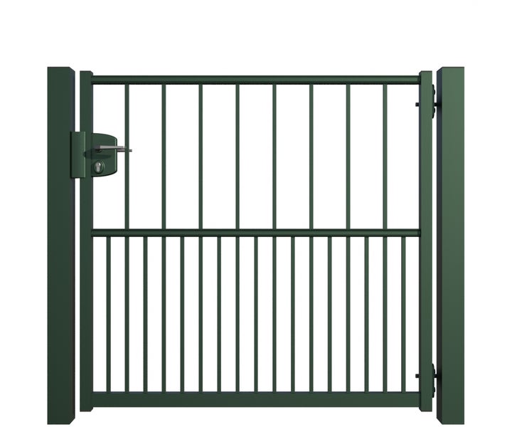 Gartentor ZAUNGURU BASIC-Linie Hamburg aus Metall, Höhe: 123cm, Breite: 150cm, 1-flügelig inkl. Pfosten, Schloss und Zubehör, Feuerverzinkt und zusätzlich in RAL 6005 Moosgrün pulverbeschichtet