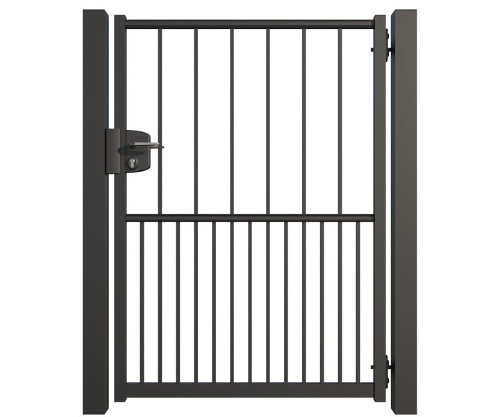 Gartentor ZAUNGURU BASIC-Linie Hamburg aus Metall, Höhe: 143cm, Breite: 123cm, 1-flügelig inkl. Pfosten, Schloss und Zubehör, Feuerverzinkt und zusätzlich in RAL 7016 Anthrazitgrau pulverbeschichtet