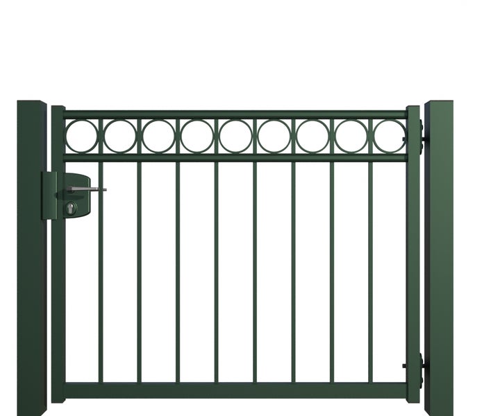 Gartentor ZAUNGURU BASIC-Linie Oldenburg Kreis aus Metall, Höhe: 103cm, Breite: 150cm, 1-flügelig inkl. Pfosten, Schloss und Zubehör, Feuerverzinkt und in RAL 6005 Moosgrün pulverbeschichtet