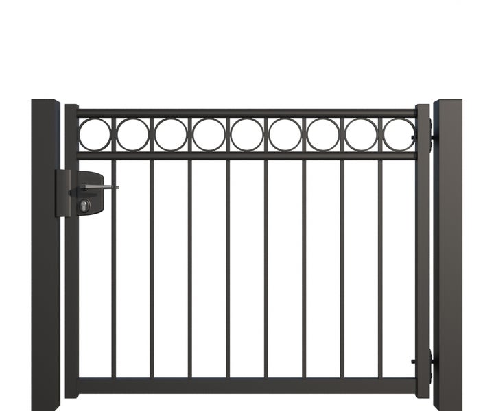 Gartentor ZAUNGURU BASIC-Linie Oldenburg Kreis aus Metall, Höhe: 103cm, Breite: 150cm, 1-flügelig inkl. Pfosten, Schloss und Zubehör, Feuerverzinkt und in RAL 7016 Anthrazitgrau pulverbeschichtet