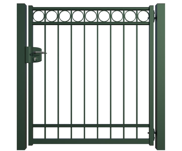 Gartentor ZAUNGURU BASIC-Linie Oldenburg Kreis aus Metall, Höhe: 143cm, Breite: 150cm, 1-flügelig inkl. Pfosten, Schloss und Zubehör, Feuerverzinkt und in RAL 6005 Moosgrün pulverbeschichtet