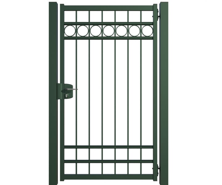 Gartentor ZAUNGURU BASIC-Linie Oldenburg Kreis aus Metall, Höhe: 183cm, Breite: 123cm, 1-flügelig inkl. Pfosten, Schloss und Zubehör, Feuerverzinkt und in RAL 6005 Moosgrün pulverbeschichtet
