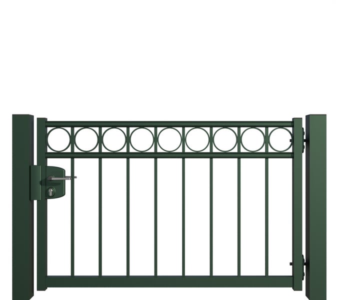 Gartentor ZAUNGURU BASIC-Linie Oldenburg Kreis aus Metall, Höhe: 83cm, Breite: 150cm, 1-flügelig inkl. Pfosten, Schloss und Zubehör, Feuerverzinkt und in RAL 6005 Moosgrün pulverbeschichtet