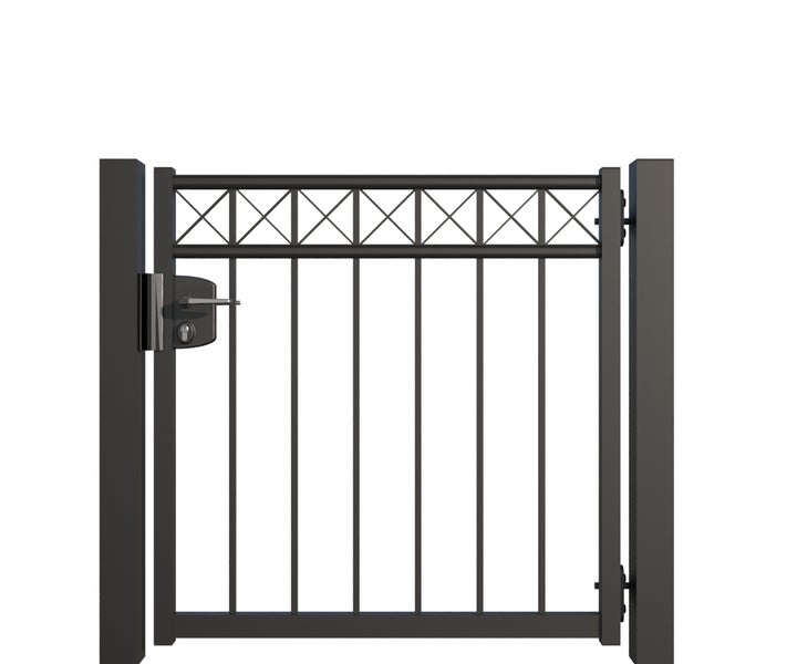 Gartentor ZAUNGURU BASIC-Linie Oldenburg Kreuz aus Metall, Höhe: 103cm, Breite: 123cm, 1-flügelig inkl. Pfosten, Schloss und Zubehör, Feuerverzinkt und in RAL 7016 Anthrazitgrau pulverbeschichtet