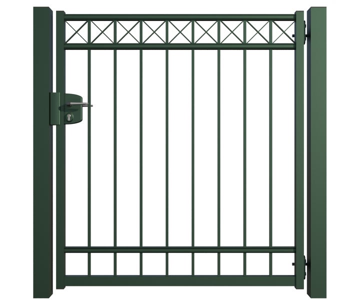 Gartentor ZAUNGURU BASIC-Linie Oldenburg Kreuz aus Metall, Höhe: 143cm, Breite: 150cm, 1-flügelig inkl. Pfosten, Schloss und Zubehör, Feuerverzinkt und in RAL 6005 Moosgrün pulverbeschichtet