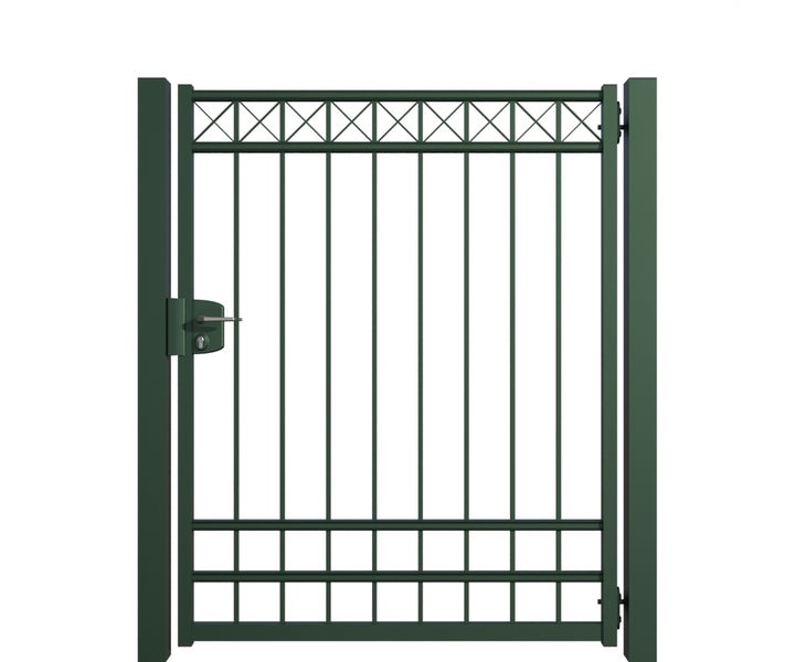 Gartentor ZAUNGURU BASIC-Linie Oldenburg Kreuz aus Metall, Höhe: 163cm, Breite: 150cm, 1-flügelig inkl. Pfosten, Schloss und Zubehör, Feuerverzinkt und in RAL 6005 Moosgrün pulverbeschichtet