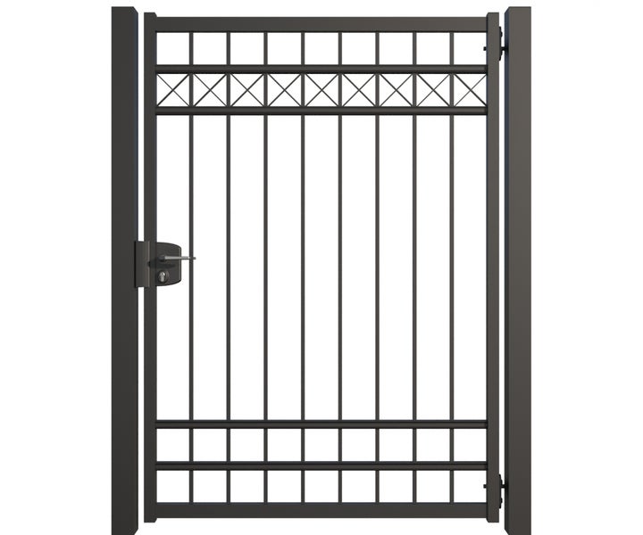 Gartentor ZAUNGURU BASIC-Linie Oldenburg Kreuz aus Metall, Höhe: 183cm, Breite: 150cm, 1-flügelig inkl. Pfosten, Schloss und Zubehör, Feuerverzinkt und in RAL 7016 Anthrazitgrau pulverbeschichtet