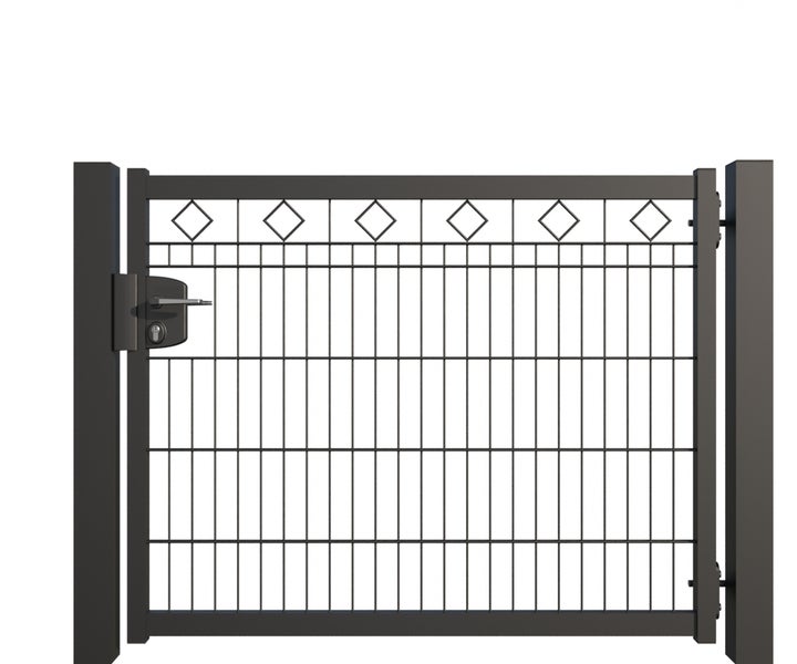 Gartentür ZAUNGURU BASIC-Linie Raute aus Metall, Höhe: 103cm, Breite: 150cm, 1-flügelig inkl. Pfosten, Schloss und Zubehör, Feuerverzinkt und zusätzlich in RAL 7016 Anthrazitgrau pulverbeschichtet