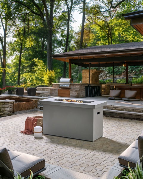 Gas-Feuerstelle für den Außenbereich. Diese Gasfeuerstelle bietet Ihnen sofortige, rauchfreie Wärme ohne Rauch, Asche oder Brennholz und ist damit die perfekte Lösung, um die Outdoor-Saison zu verlängern. Schließen Sie sie einfach an eine Gasflasche an und zünden Sie sie per Knopfdruck, um gleichmäßige Wärme zu genießen, ohne den Aufwand herkömmlicher Feuerstellen. Die breite Brennerfläche sorgt für eine gleichmäßige Wärmeverteilung und ist ideal, um an kühlen Abenden mit der Familie zusammenzusitzen. Dank ihrer kompakten Form und ihres modernen Designs fügt sie sich sowohl in größere Lounge-Sets als auch in kleinere Entspannungsbereiche ein – sei es auf der Terrasse, neben einem Gartensofa, unter einer Pergola oder in einem Pavillon. Es wird weder Strom noch zeitaufwändige Feuerzubereitung benötigt, somit ist sie eine hervorragende mobile Wärmequelle für den Außenbereich. Details: Typ Feuerstelle für Gas. Farbe: Grau. Farbton: Hellgrau. Material: Beton. Material: Glasfaserverstärkter Beton (GRC). Zusätzliches Material: Edelstahl. Brennstoff: Propangas. Abmessungen: Tiefe: 51 cm. Breite: 108 cm. Höhe: 62 cm. Gewicht: 48 kg. .Sie kaufen: 1 x Gasschlauch, 1 x Edelstahlbrenner, 1 x Gasdruckregler, 1 x Feuerstelle, 1 x Lavasteine (6 Kg), Nicht im Lieferumfang enthalten: Gasflasche, Nicht im Lieferumfang enthalten: Gasflaschenhalter. Produktvorteile: Schnelle und leichte Montage, Moderne Terrassen- und Gartenmöbel, Solide Verarbeitung, Pflegeleichtes und strapazierfähiges Material, Witterungsbeständiges Material. Montage: Installation benötigt. Zusatzinformationen: Bei der Verwendung muss der Benutzer die Brandschutzbestimmungen einhalten und sicherstellen, dass der Boden und die Umgebung feuerfest sind. Beschädigungen der Außenanstrichschicht sind vor Feuchtigkeit zu schützen. Wenn die Feuerstelle nicht benutzt wird, sollte sie über den Winter im Innenbereich aufbewahrt werden um Frostschäden zu vermeiden. Bitte schützen Sie Ihre Feuerstelle vor Regen und Feuchtigkeit, besonders wenn sie nicht in Gebrauch ist. Längere Einwirkung von Nässe oder hoher Luftfeuchtigkeit kann Rostbildung oder Schäden am Produkt verursachen. Pflegeanleitung: Glasfaserverstärkter Beton (GRC): 1.Sicherheitshinweis: Bitte stellen Sie Ihre Feuerstelle ausschließlich auf ebenem und feuerfestem Untergrund auf. 2.Achten Sie bitte darauf, dass die Feuerstelle vollständig ausgekühlt ist, bevor Sie sie reinigen. 3.Mit einem feuchten Tuch oder einer weichen Bürste lassen sich Flecken leicht entfernen. Bitte verwenden Sie dabei ausschliesslich milde Reinigungsmittel. 4.Die Feuerstelle sollte im Winter trocken und kühl drinnen gelagert werden.