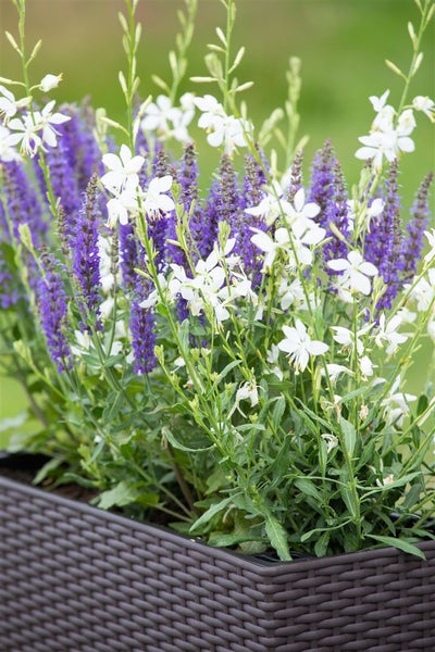 Gaura lindheimerii ‘Short Form’, die kompakte Prachtkerze, auch als Schmetterlingsblume bekannt (syn. Oenothera lindheimeri), bringt mit ihren schwebenden Blüten eine elegante, luftige Leichtigkeit in jeden Garten. Diese langlebige Staude überzeugt mit unzähligen sternförmigen Blüten in zartem Weiß mit roséfarbenem Schimmer, die von Juni bis in den Oktober nahezu unermüdlich erscheinen und an feinen, verzweigten Stielen über dem Laub tanzen. Das schmale, lanzettliche Blattwerk zeigt ein frisches Grün mit gelegentlich rötlichen Nuancen und unterstreicht den natürlichen, lockeren Wuchs. ‘Short Form’ bleibt besonders kompakt und standfest, erreicht in der Regel etwa 40 bis 60 cm Höhe und eignet sich damit hervorragend für den Vordergrund im Staudenbeet, den sonnigen Vorgarten oder als zarte Begleitung in der Rabatte.
