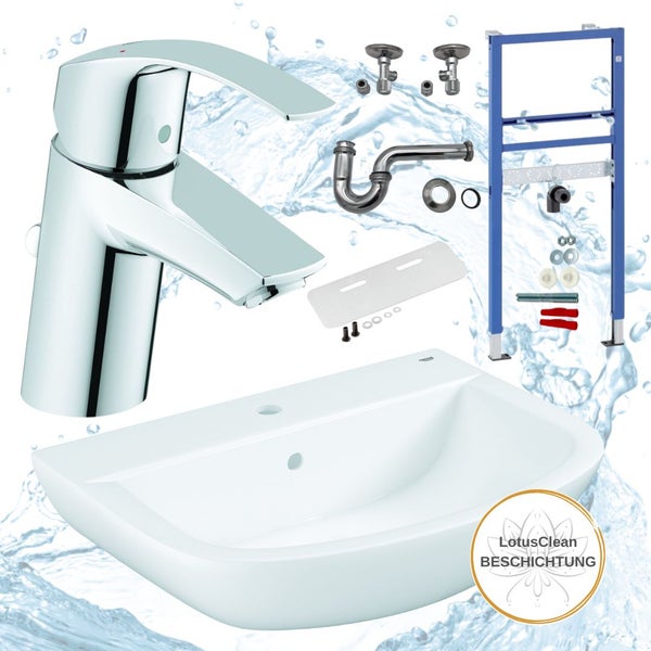 Waschtisch-Komplettset mit Geberit Vorwandelement, wandhängendem Waschtisch, Grohe Armatur, Schallschutz-Set und Zubehör
